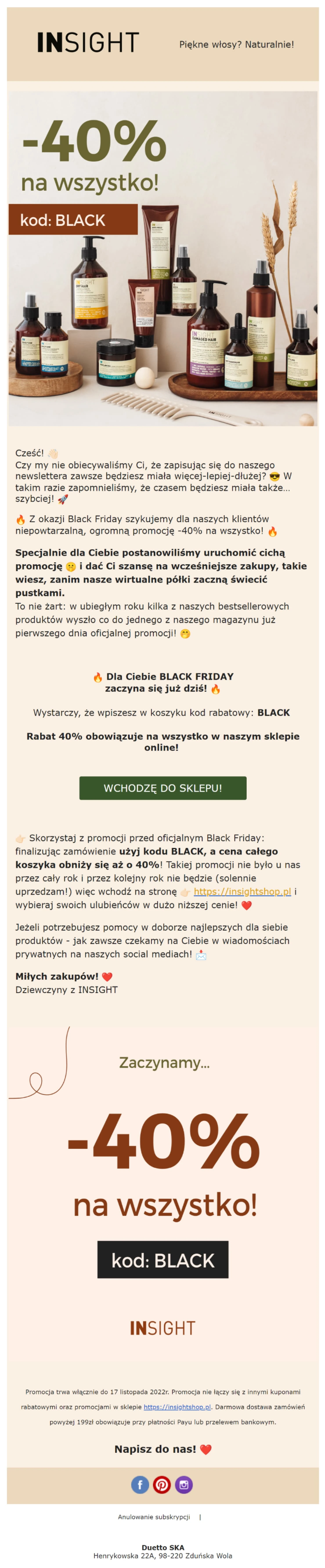 21 listopada wysłaliśmy e-mail, który informował o rozpoczęciu promocji. Uwzględniliśmy w nim więcej szczegółów, korzyści, a także link do strony zakupu.
