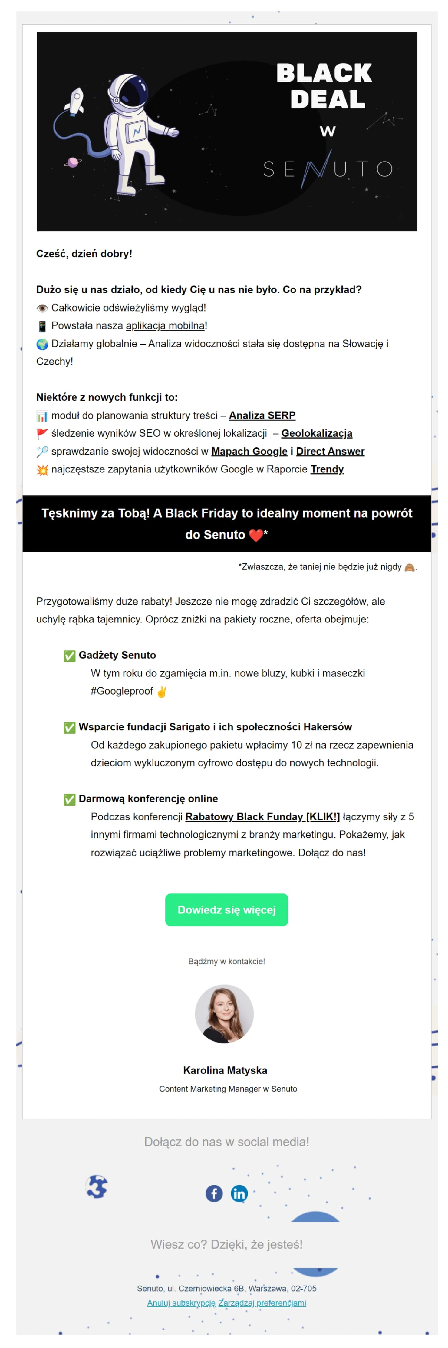Tekst jest lekki i angażujący, otwiera i kończy się żartem – humor to świetny sposób, by wyróżnić się w zapełnionej skrzynce odbiorczej.