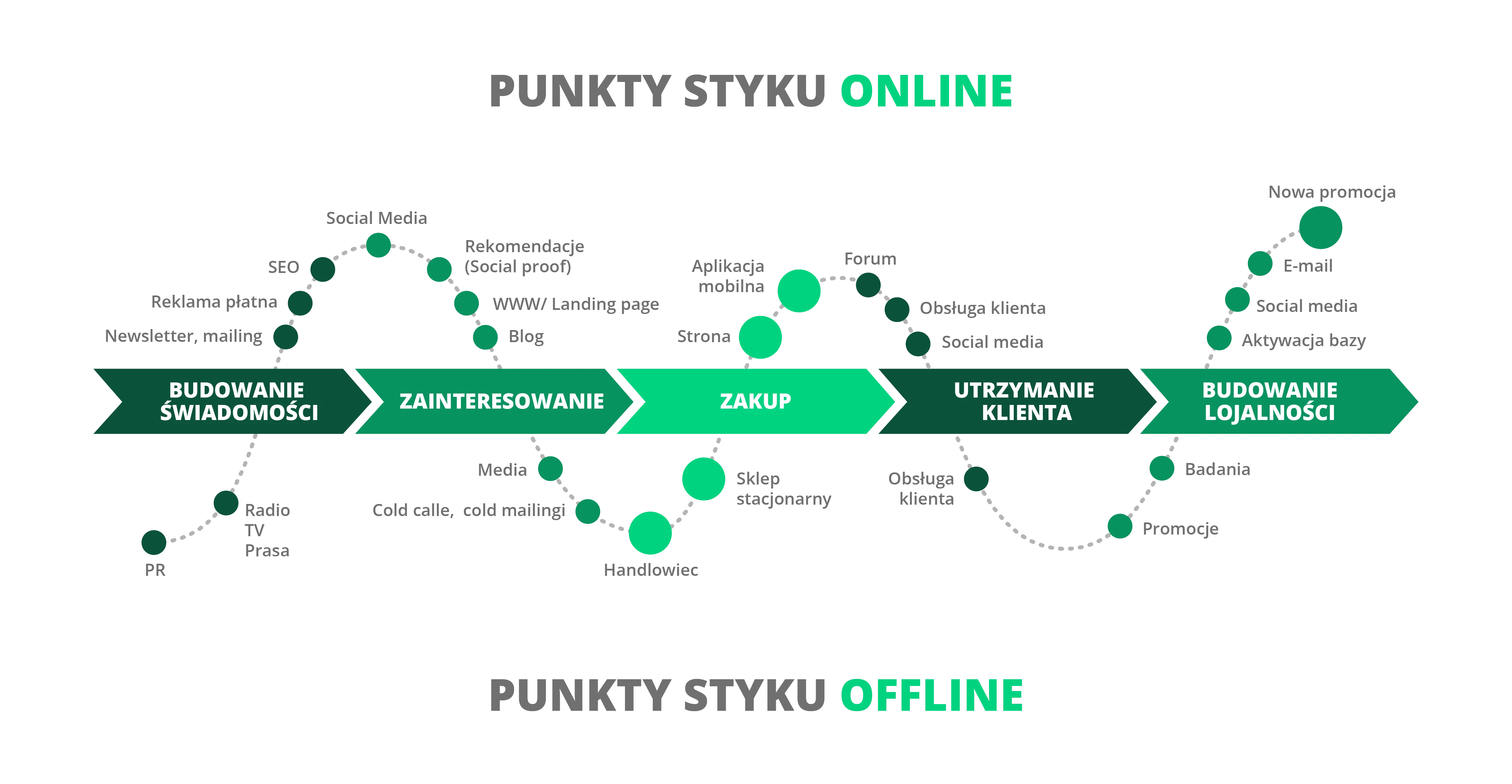 Potencjalne punkty styku są ciekawie przedstawione na poniższej infografice, która pokazuje, gdzie klient spotyka się z Twoją marką przed, w trakcie, oraz po zakupie. Dobrze zobrazowano to na grafice przygotowanej przez sare.pl: