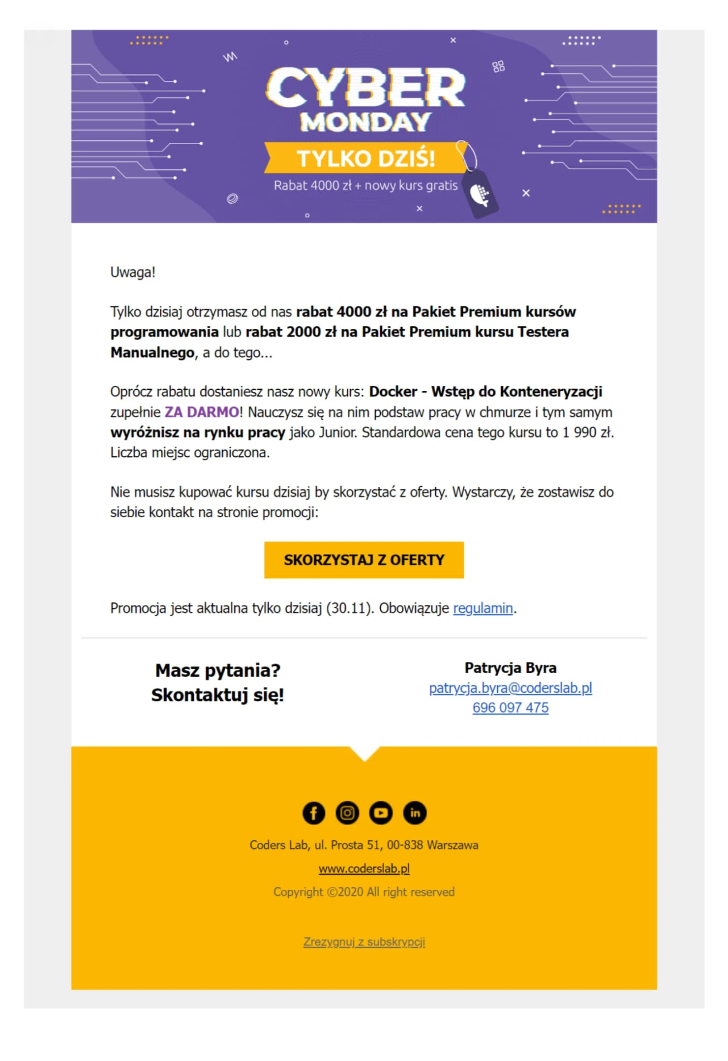 Cyber Week to promocje ograniczone czasowo. Tak jak Coders Lab, upewnij się, że odbiorcy mają tego świadomość!