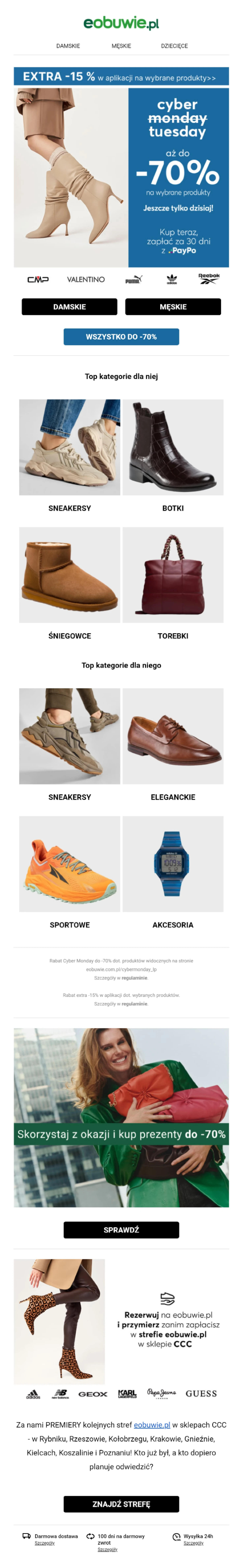 Eobuwie zapewniło Cyber Tuesday, dzięki czemu marka dała dodatkowy czas na skorzystanie z promocji.