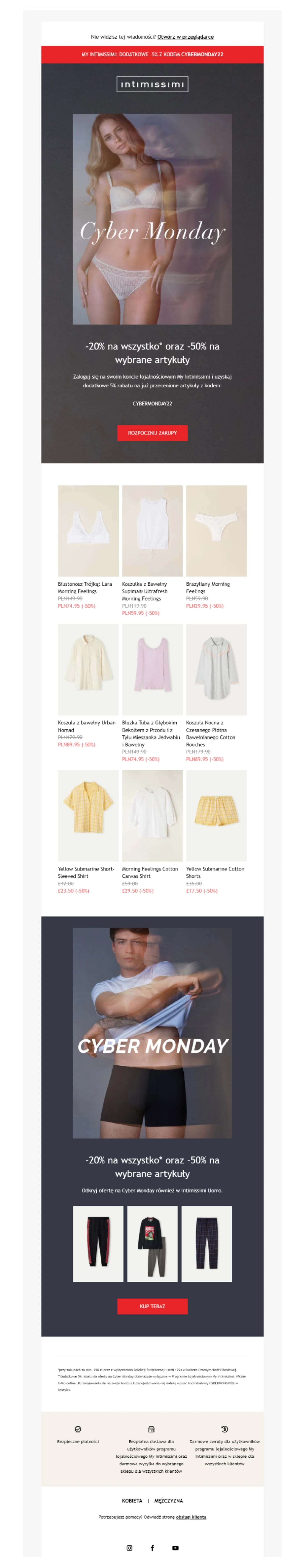E-mail został podzielony na dwie główne sekcje: produkty dla mężczyzn i produkty dla kobiet.