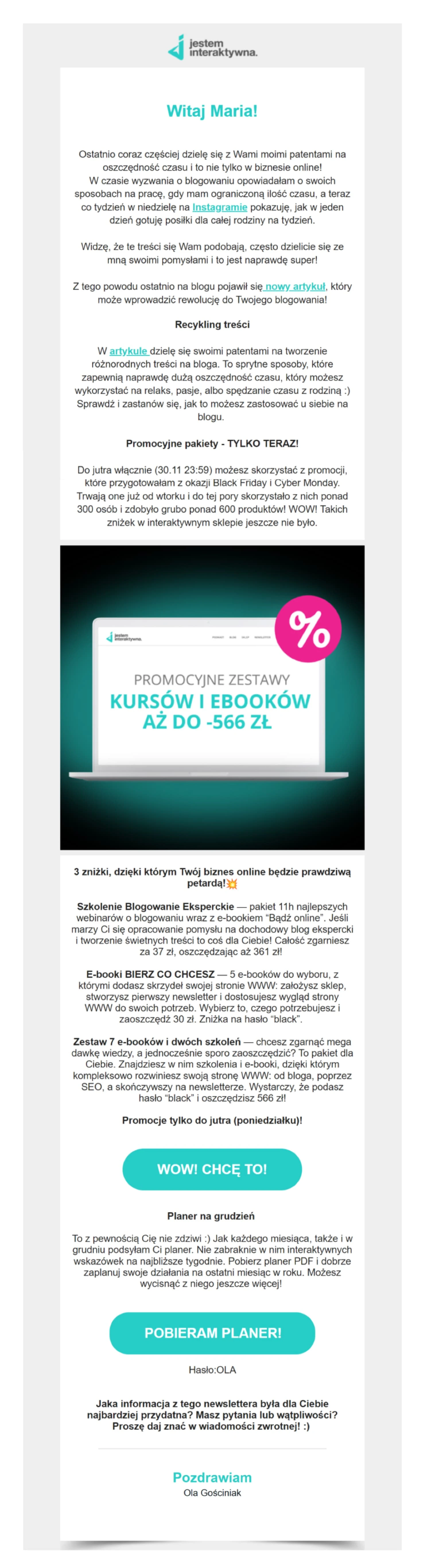 E-mail 2: wysyłany dokładnie wtedy, kiedy rozpoczynasz promocję, aby klienci mogli od razu dokonać zakupu.