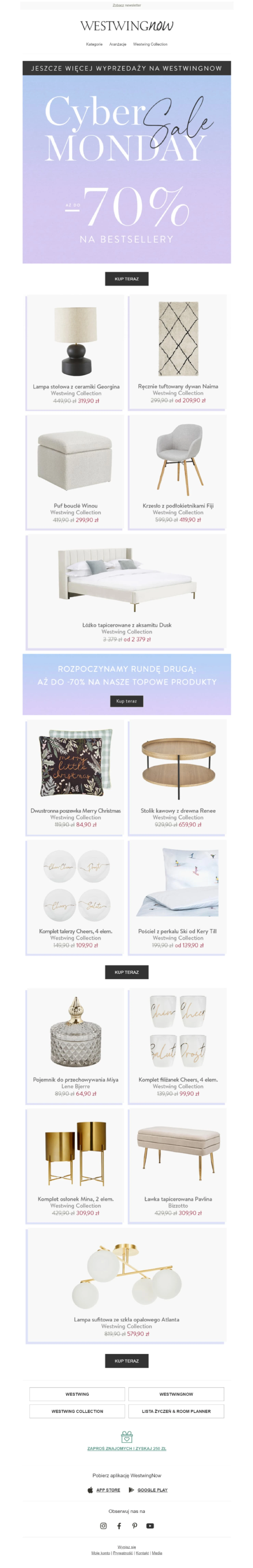 Szukasz więcej przykładów z okazji Cyber Week? Sięgnij do naszego artykułu o najlepszych e-mailach na Black Friday. Mamy również bibliotekę szablonów na Cyber Monday i inne okazje świąteczne, z których możesz skorzystać w Twojej kampanii.