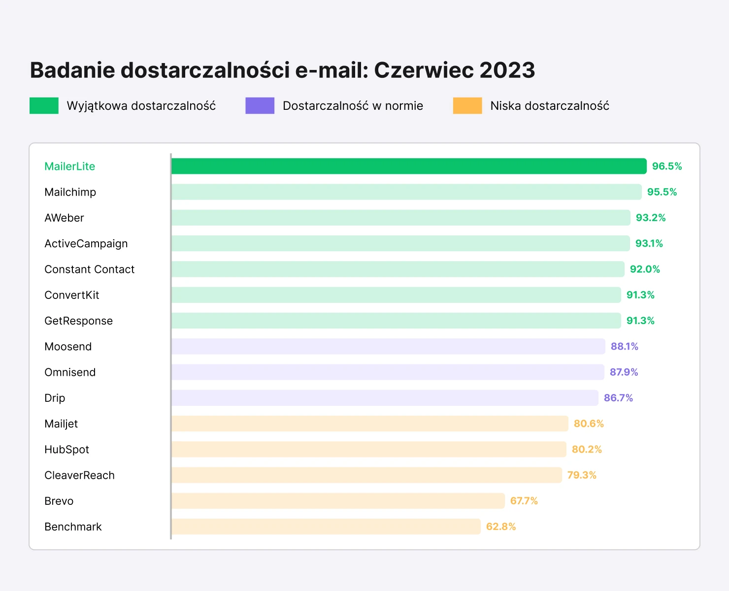 W MailerLite wiemy, jak ważna jest dostarczalność i jak istotna jest w kontekście prowadzenia biznesu online. Zależy nam na tym! Dlatego od lat dokładamy wszelkich starań, aby na bieżąco zgłębiać ten temat. Po raz kolejny otrzymaliśmy pierwsze miejsce w rankingu dostarczalności systemów do e-mail marketingu stworzonym przez Emailtooltester.