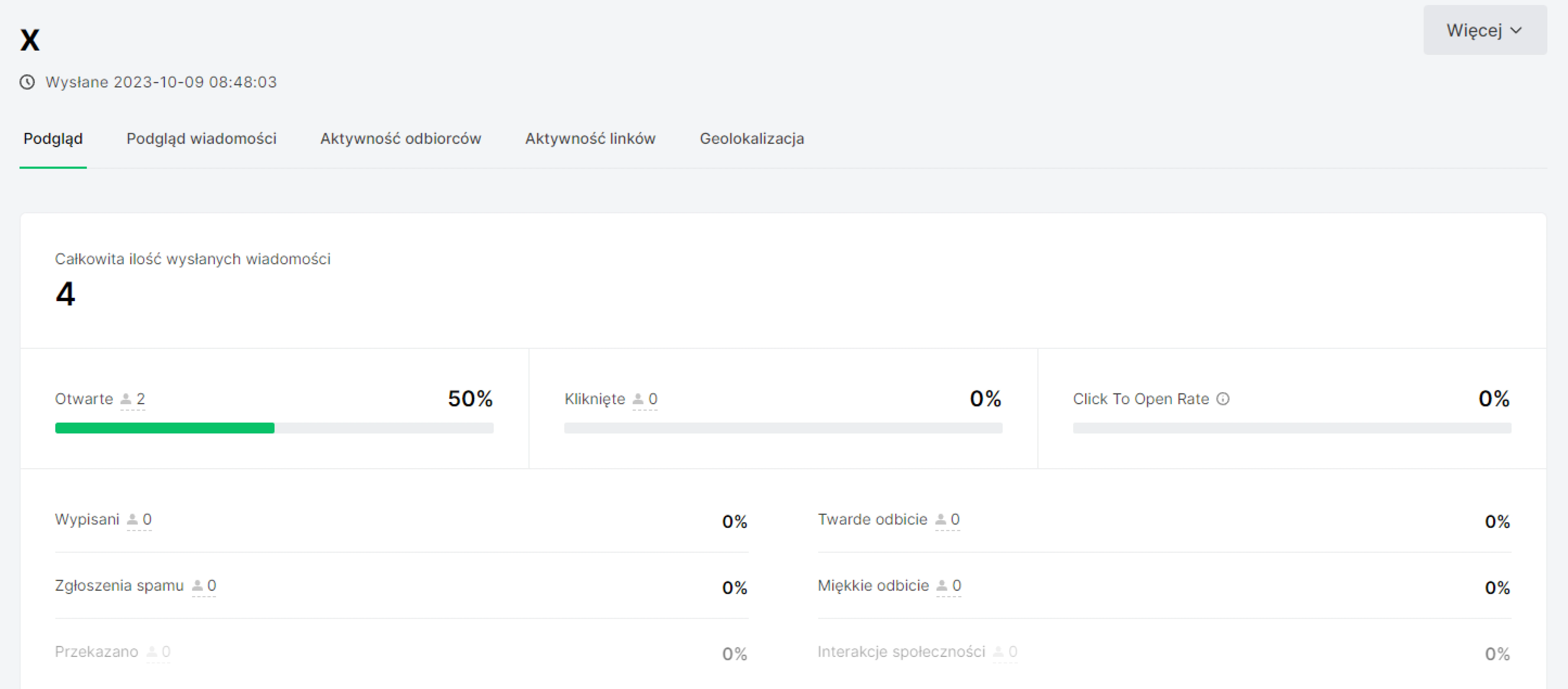 W zakładce Podgląd w raportach znajdziesz dostęp do istotnych informacji dotyczących skuteczności Twoich wysyłek. Statystyki, na które warto zwrócić uwagę, chcąc zweryfikować dostarczalność, to:
