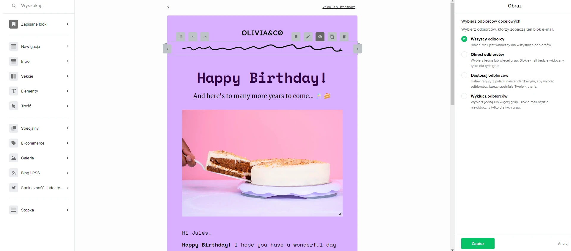 Czyli opcja domyślna. Jeśli zaznaczysz tę opcję, dany blok będzie wyświetlany wszystkim odbiorcom newslettera.