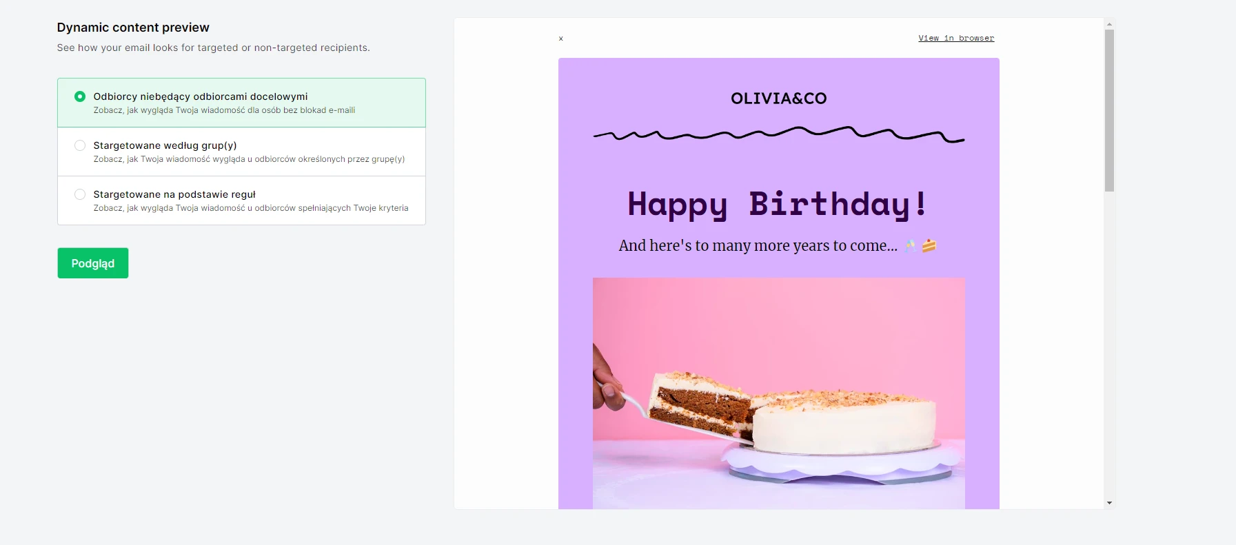 Po tym, jak wybierzesz opcję targetowania, podgląd treści dynamicznych umożliwi Ci sprawdzenie, jak będzie wyglądać Twoja wiadomość u różnych grup odbiorców.