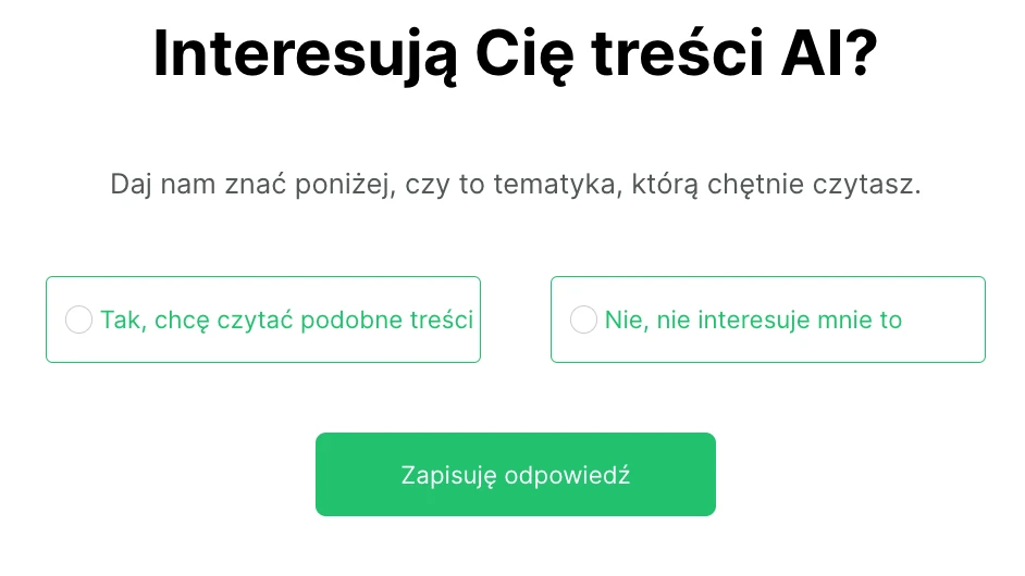 Kolejnym sposobem na zbieranie istotnych danych jest użycie ankiet w e-mailu - postępujesz tu w bardzo podobny sposób, co przy centrum preferencji. Zadaj pytania w ankiecie, a następnie, bazując na ich odpowiedziach, dodaj odbiorców do poszczególnych grup lub uzupełnij poszczególne pola. Umieszczając ankietę w e-mailu sprawiasz, że odbiorcy jest łatwiej ją uzupełnić. Przykład możesz zobaczyć poniżej.