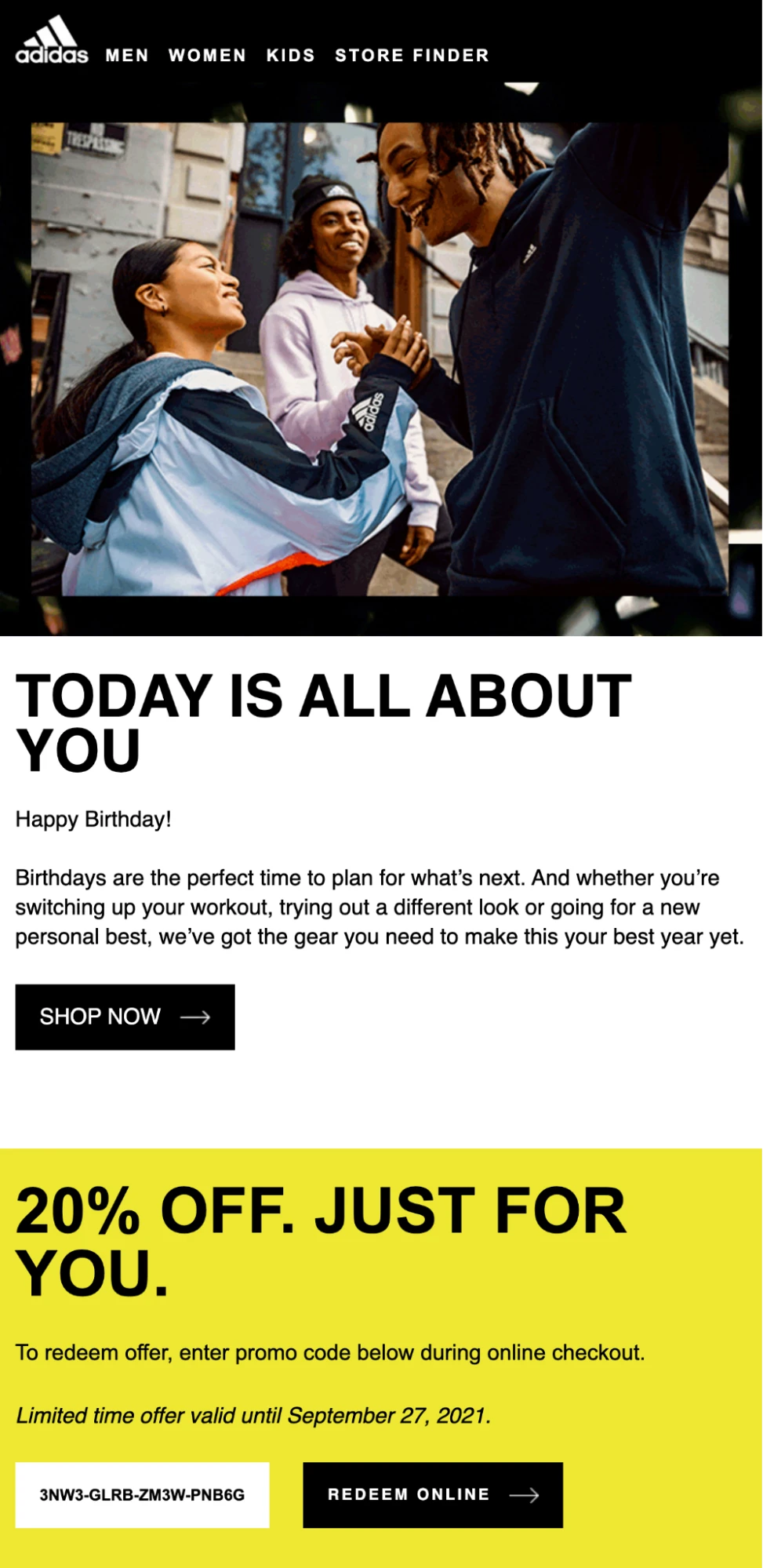 Przykładowa urodzinowa wiadomość e-mail od Adidasa jest bardzo prosta. Składa odbiorcy życzenia z okazji urodzin, a następnie zapewnia mu hojną 20% zniżkę, która obowiązuje przez kolejny tydzień.