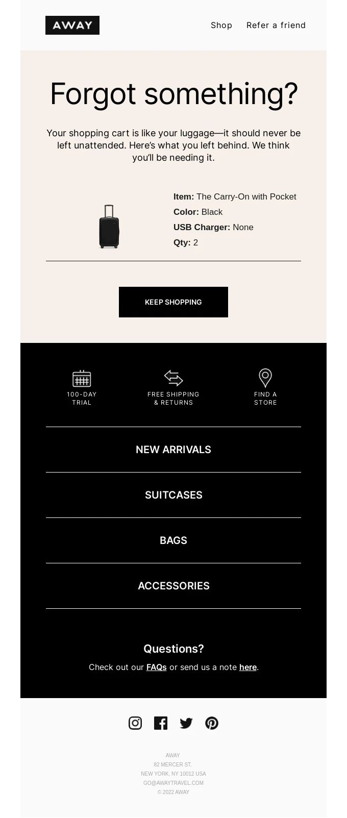 Dobry przykład wiadomości e-mail dotyczącej porzuconego koszyka możesz zobaczyć na poniższym zrzucie ekranu. Wiadomość Away zawiera szczegóły produktu i proste przypomnienie z prośbą o kontynuowanie zakupów.