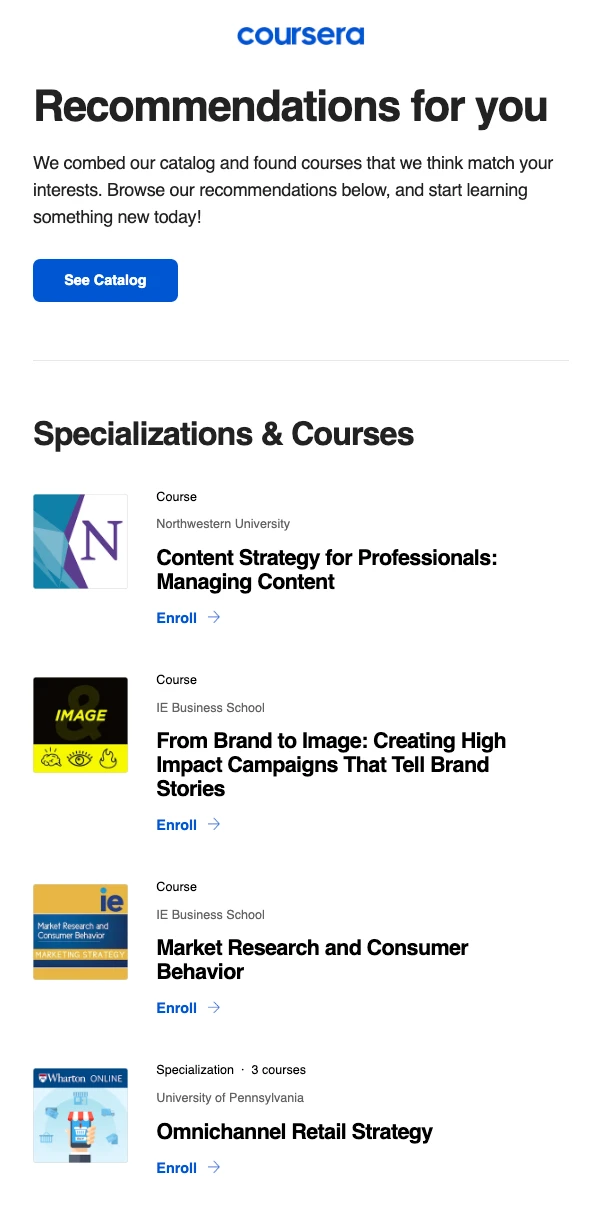 Coursera wysyła tę wiadomość e-mail z rekomendacją kilka miesięcy po początkowym zakupie subskrypcji, dając użytkownikom dużo czasu na ukończenie kursu, na który się zapisali.