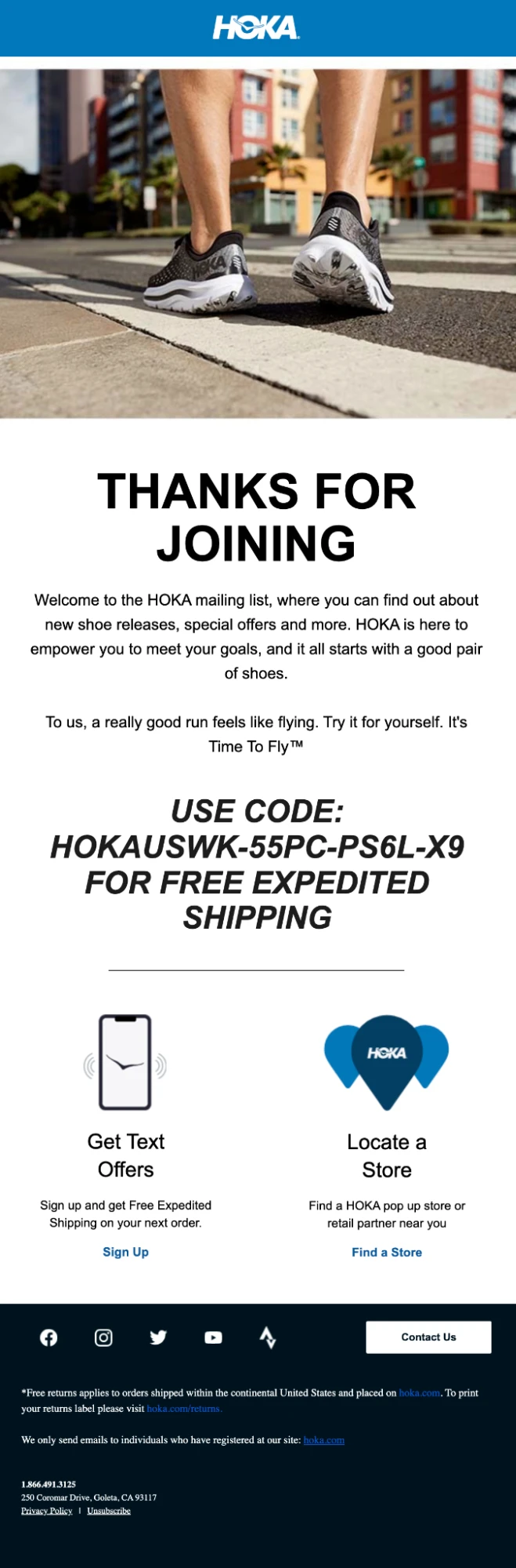 Marka biegowa Hoka robi to dobrze. W poniższym powitalnym e-mailu umieścili kod na bezpłatną wysyłkę, przedstawili markę i wyjaśnili, jakiego rodzaju treści będą dostarczać.