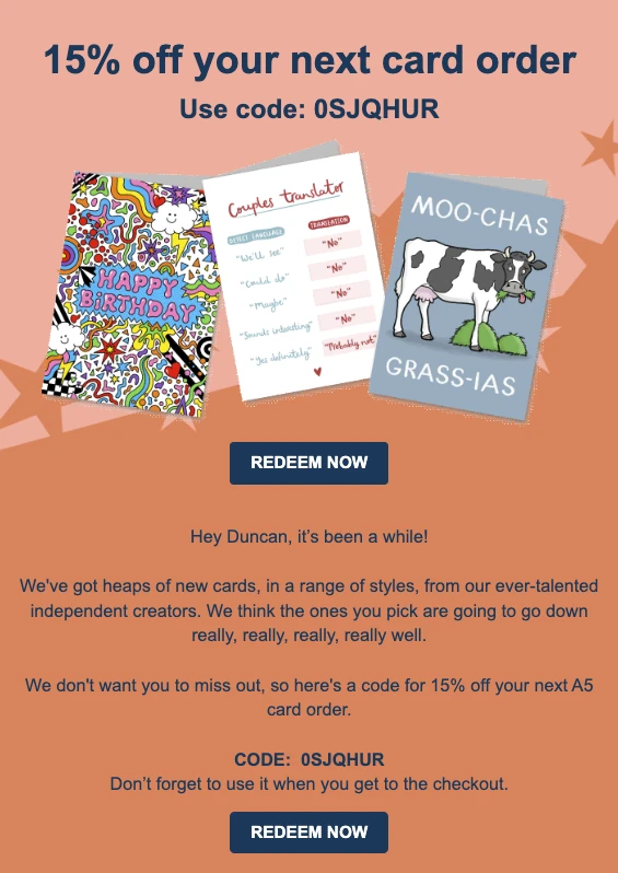 Sprzedawca kart online MoonPig stosuje tę pierwszą strategię w swojej kampanii ponownego zaangażowania. Wiadomość e-mail ma temat „15% zniżki, ponieważ za Tobą tęsknimy”, a jej treść zawiera wzmiankę o nowych kartach i kod rabatowy.