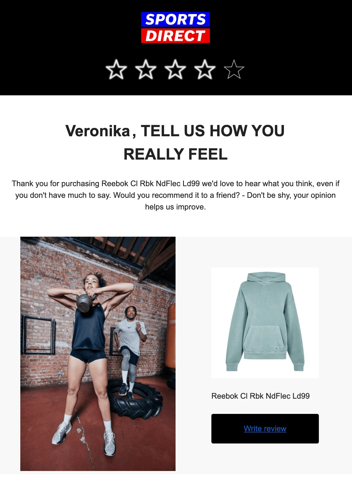 Wyeksponuj ostatnio zakupione produkty i dołącz link do platformy, na której klienci mogą zostawić recenzję, na przykład tak jak robi to Sports Direct w poniższym e-mailu.