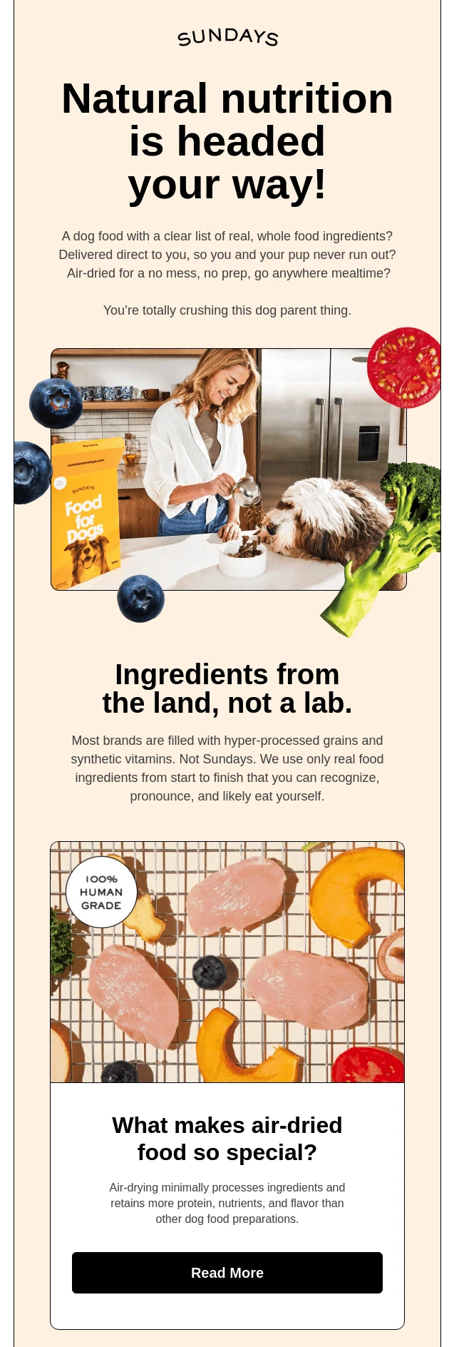 Ten e-mail od Sundays jest dobrym przykładem wiadomości e-mail po zakupie. Buduje emocje związane z oczekiwaniem na dostawę produktu. Wyjaśnia, czemu właśnie ta karma dla psów jest tak wspaniała oraz odsyła do dalszych informacji.