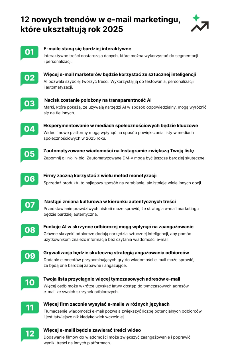 Poprosiliśmy nasz zespół o przeanalizowanie 2024 roku i zasugerowanie najnowszych trendów w e-mail marketingu, które będą kluczowe w 2025 r. Poznaj 12 najnowocześniejszych strategii, które pomogą rozwinąć listę, zwiększyć zaangażowanie i skuteczniej zarabiać na odbiorcach w tym roku i później.