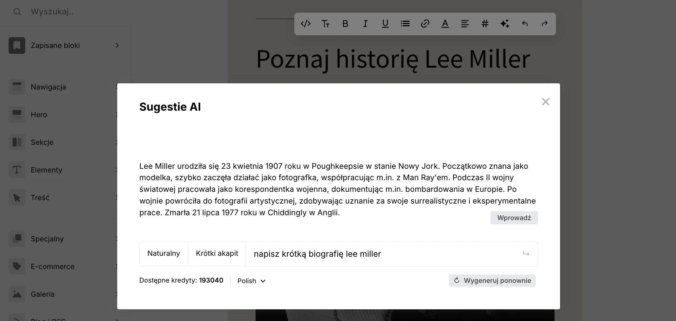 W MailerLite można łatwo i szybko generować treści, klikając ikonę AI w dowolnym polu tekstowym. Następnie wystarczy napisać podpowiedź opisującą tekst, który ma zostać wygenerowany.
