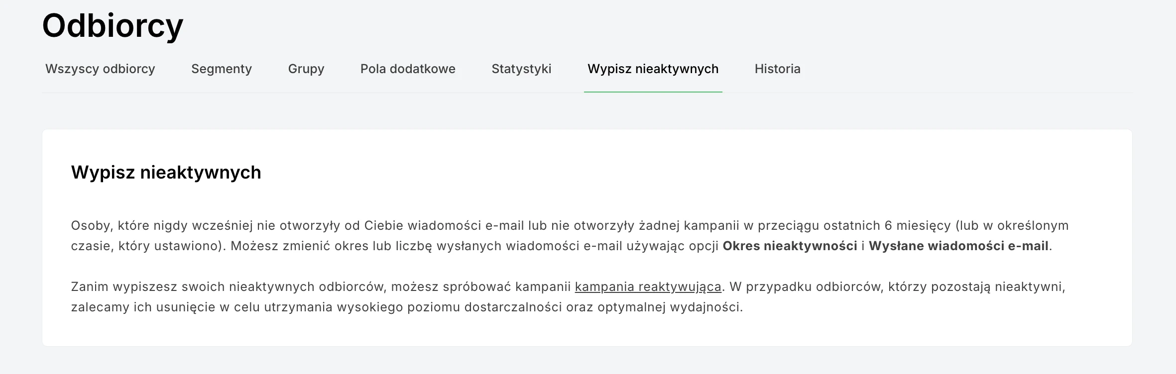 Rekomendujemy usuwanie osób, które nie otworzyły żadnego e-maila w ciągu ostatnich 6 miesięcy, zakładając, że wysyłasz wiadomości regularnie.