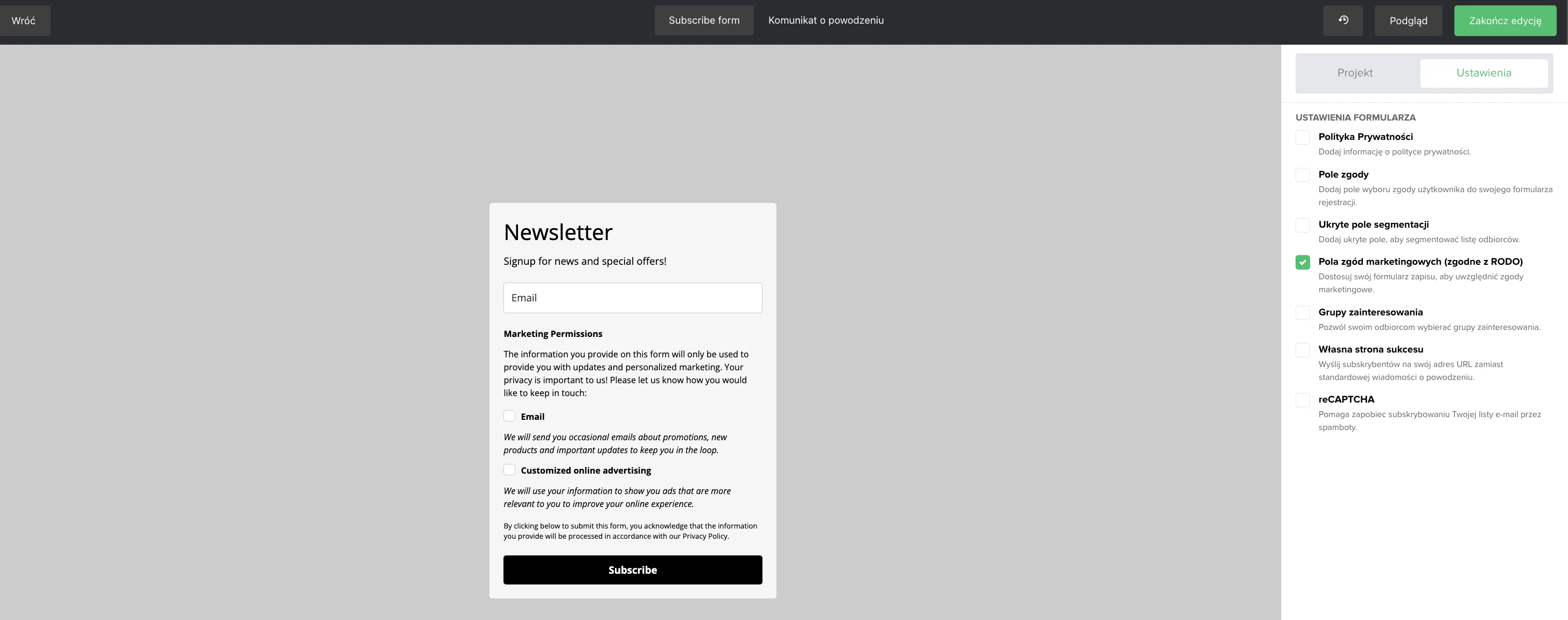 Możesz dodać wiele pól wyboru, segmentować subskrybentów za pomocą ukrytych pól, wstawiać uprawnienia RODO oraz wysyłać użytkowników na podstronę z potwierdzeniem zapisu.