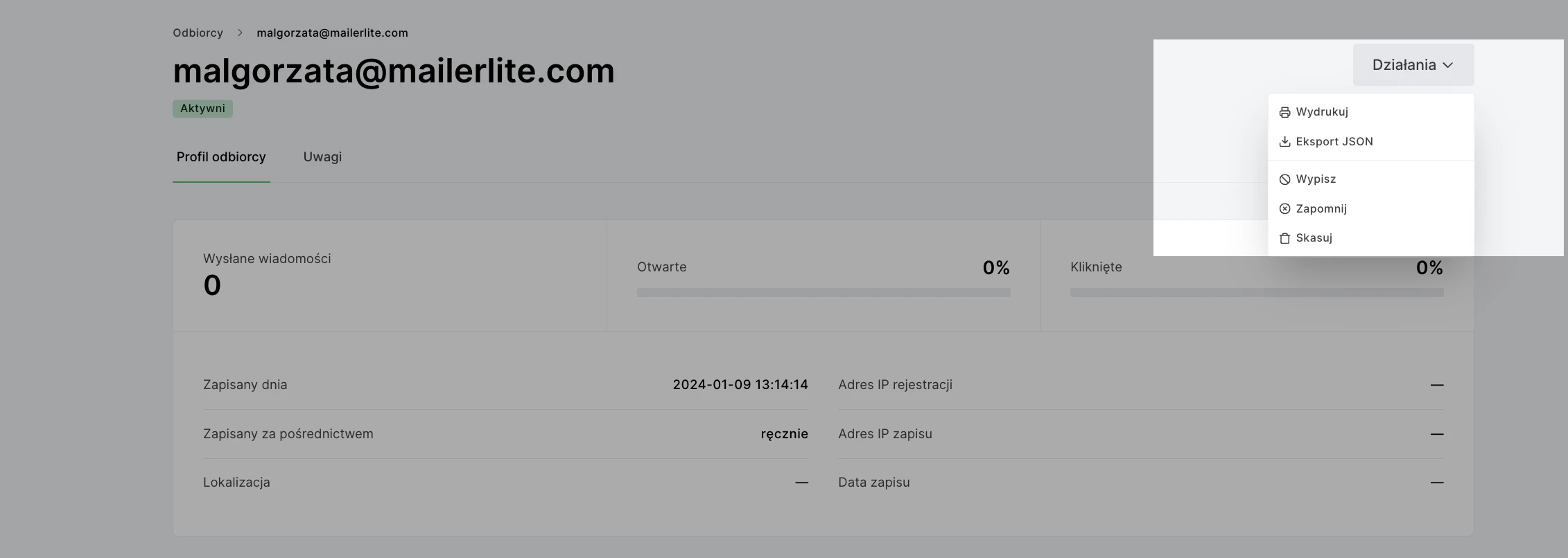 Skasuj: usuwa subskrybenta z Twojego konta, ale wszystkie jego informacje są nadal przechowywane na wypadek, gdyby ponownie zapisał się na Twoją listę.