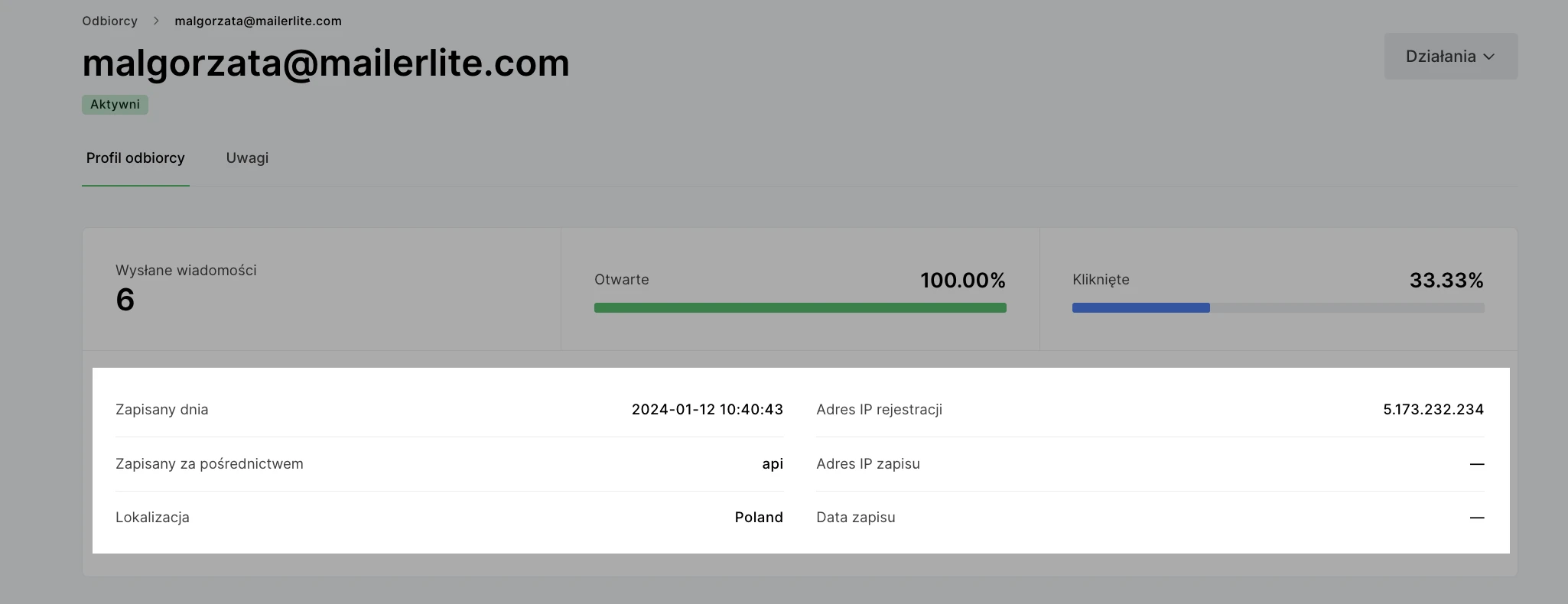MailerLite wyświetla te informacje w profilach odbiorców. Ważne jest, aby pamiętać, że ten cenny dowód można uzyskać tylko od użytkowników, którzy zapisują się na listę odbiorców za pośrednictwem formularzy MailerLite.