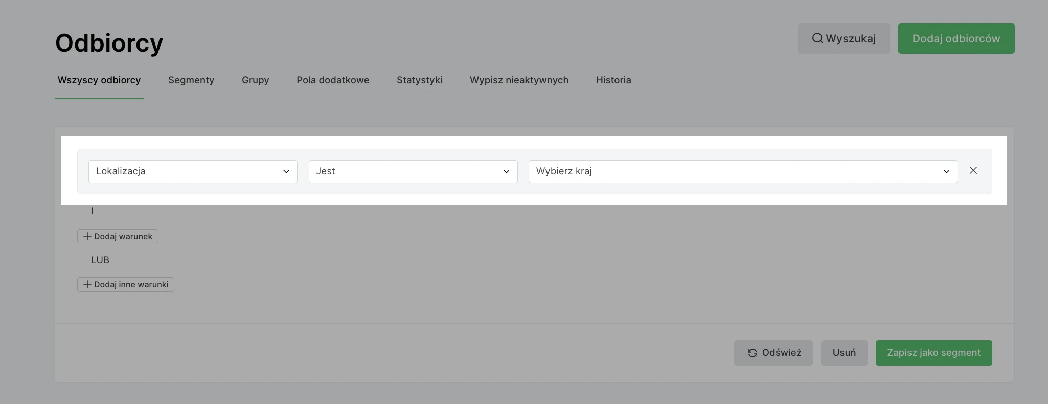 MailerLite posiada regułę w filtrze subskrybentów o nazwie Lokalizacja, gdzie można sortować subskrybentów według ich lokalizacji.