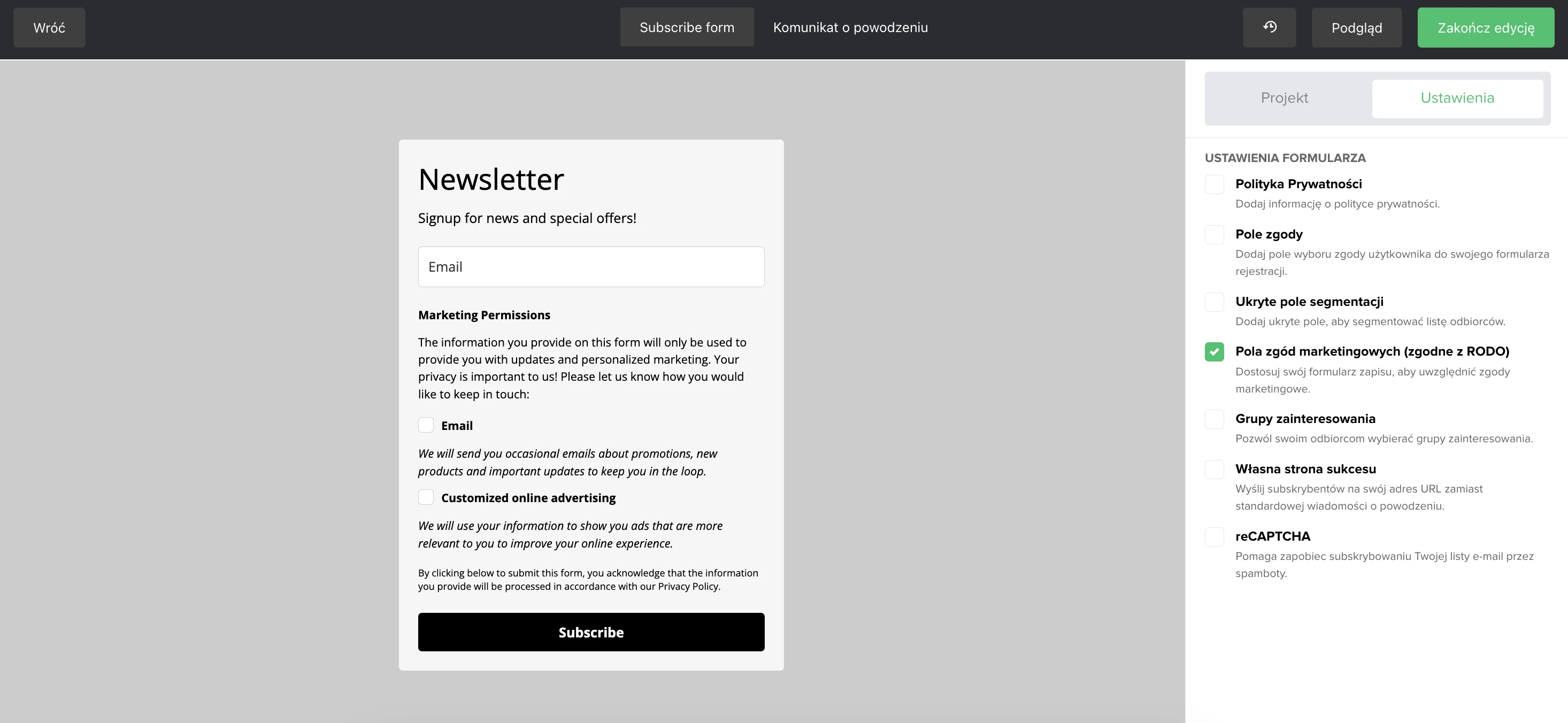 Ta konfiguracja pomaga zbierać zgody w sposób zgodny ze standardami RODO, chroniąc zarówno organizację, jak i subskrybentów.