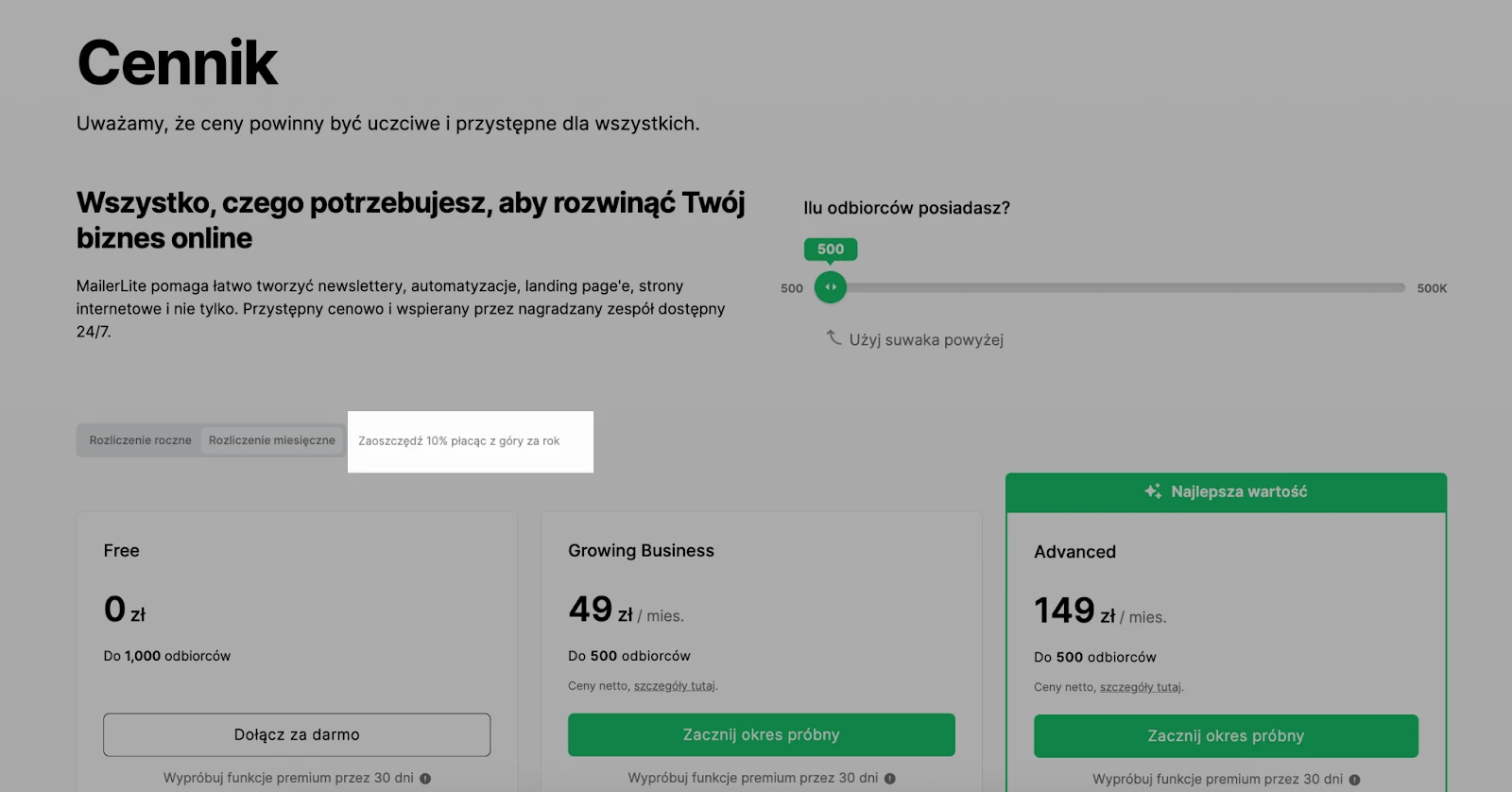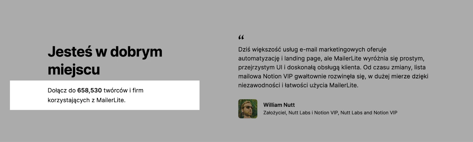Jak widzisz na obrazku powyżej, MailerLite wykorzystuje dowód społeczny m.in. poprzez: