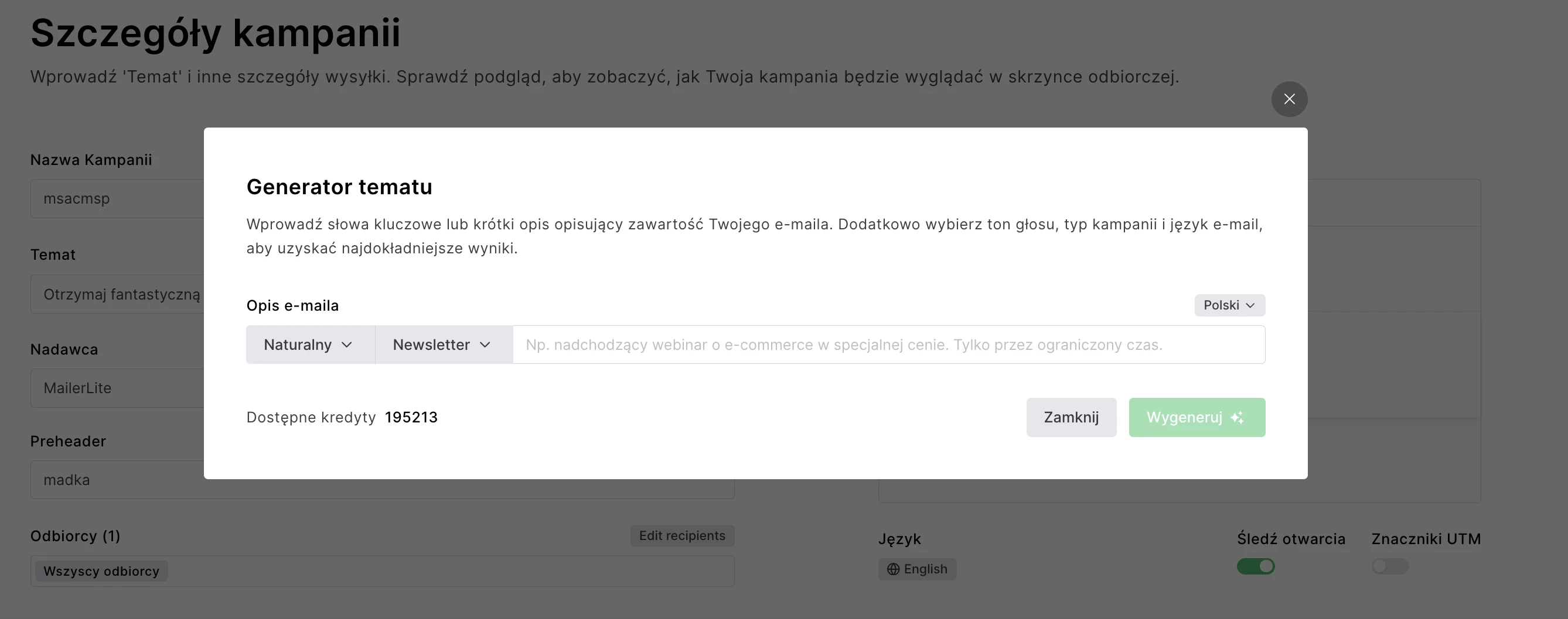 W MailerLite możesz wykorzystać sztuczną inteligencję do generowania tematów dla Twoich kampanii. Wystarczy, że w kreatorze wybierzesz opcję Zasugeruj ✨, a Twój inteligentny przyjaciel pomoże Ci w stworzeniu tematu dopasowanego do tonu głosu Twojej marki.