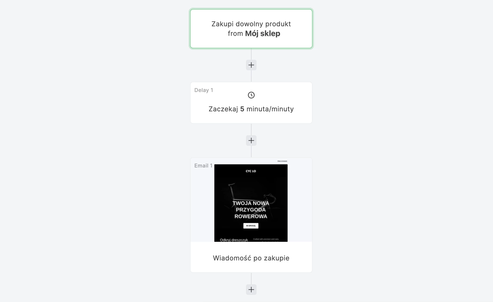Tymczasem wyzwalacz Zakupy dowolnego produktu może być używany do wysyłania ogólnych wiadomości posprzedażowych, z których skorzystają wszyscy kupujący, takich jak prośby o recenzję, e-maile rekomendacyjne lub ankiety dla klientów.