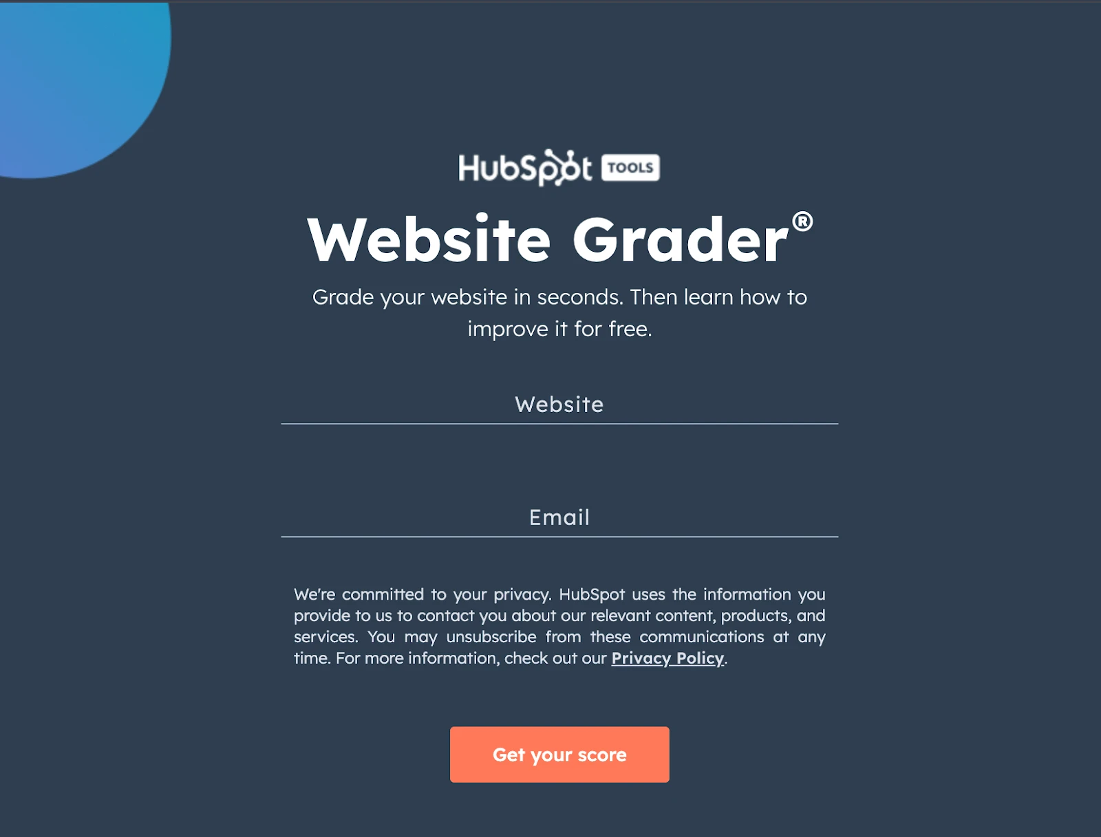 HubSpot oferuje darmowe narzędzia marketingowe i sprzedażowe, takie jak Website Grader. Narzędzie to pozwala użytkownikom ocenić, jak dobrze ich strona internetowa radzi sobie pod kątem SEO, wydajności, bezpieczeństwa i optymalizacji mobilnej. Po wykonaniu analizy narzędzie dostarcza raport z wynikami i sugestiami, jak poprawić stronę. Aby otrzymać pełen raport, użytkownik musi podać swój adres e-mail.