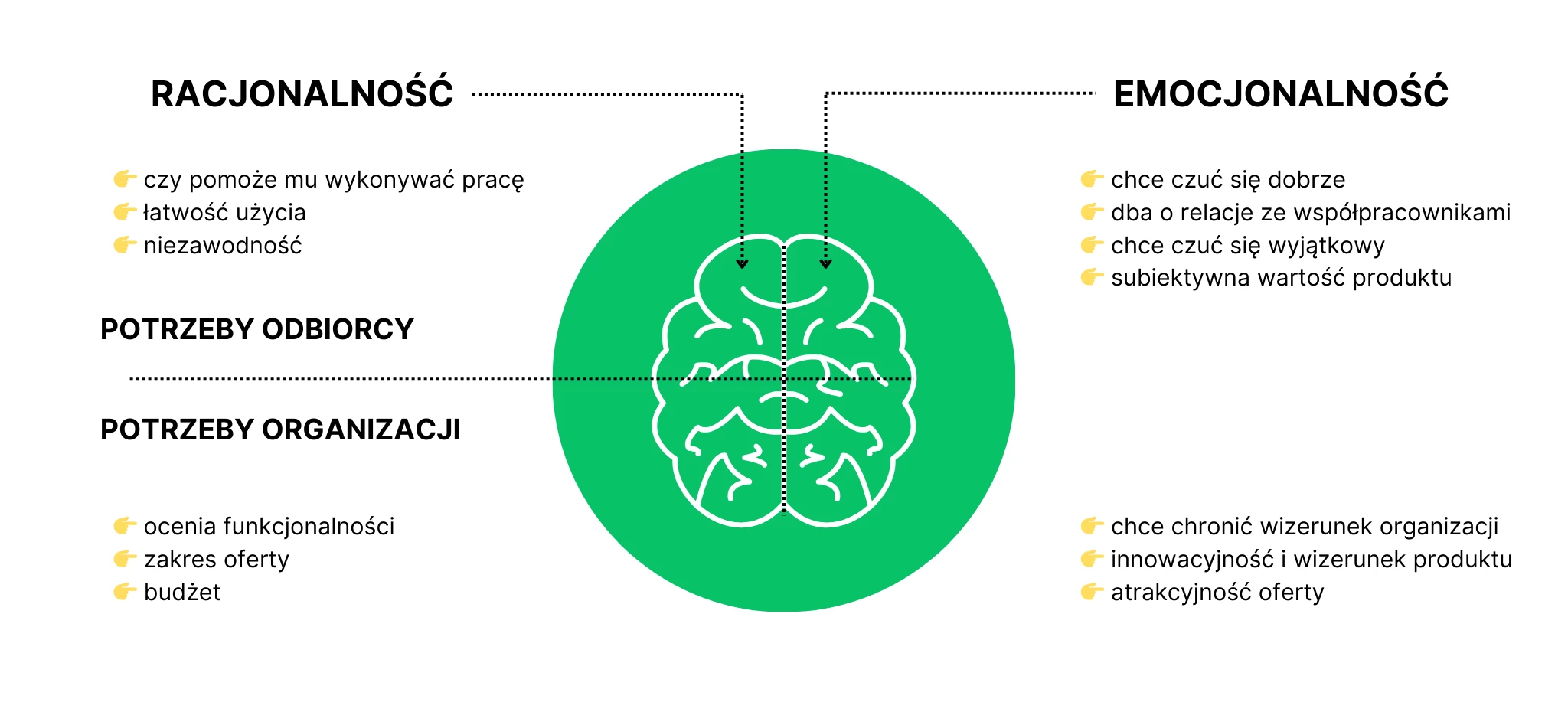W przypadku procesu decyzyjnego w sektorze B2B indywidualne potrzeby odbiorcy są powiązane z rzeczywistymi potrzebami organizacji. Zrozumienie ich wzajemnego wpływu jest kluczem do nakłonienia odbiorców do subskrypcji i stworzenia skutecznego przekazu e-mail marketingowego. Pamiętaj, że odbiorca podejmując decyzję o zapisie na Twój newsletter poszukuje informacji, które zaspokoją jego racjonalne i emocjonalne potrzeby, a także pomogą mu sprostać oczekiwaniom ze strony firmy. Call to action odnoszące się do emocji, np. „Dołącz do najlepszych e-mail marketerów w Polsce” powinno wtedy współgrać z racjonalnym przekazem obiecującym realne korzyści.