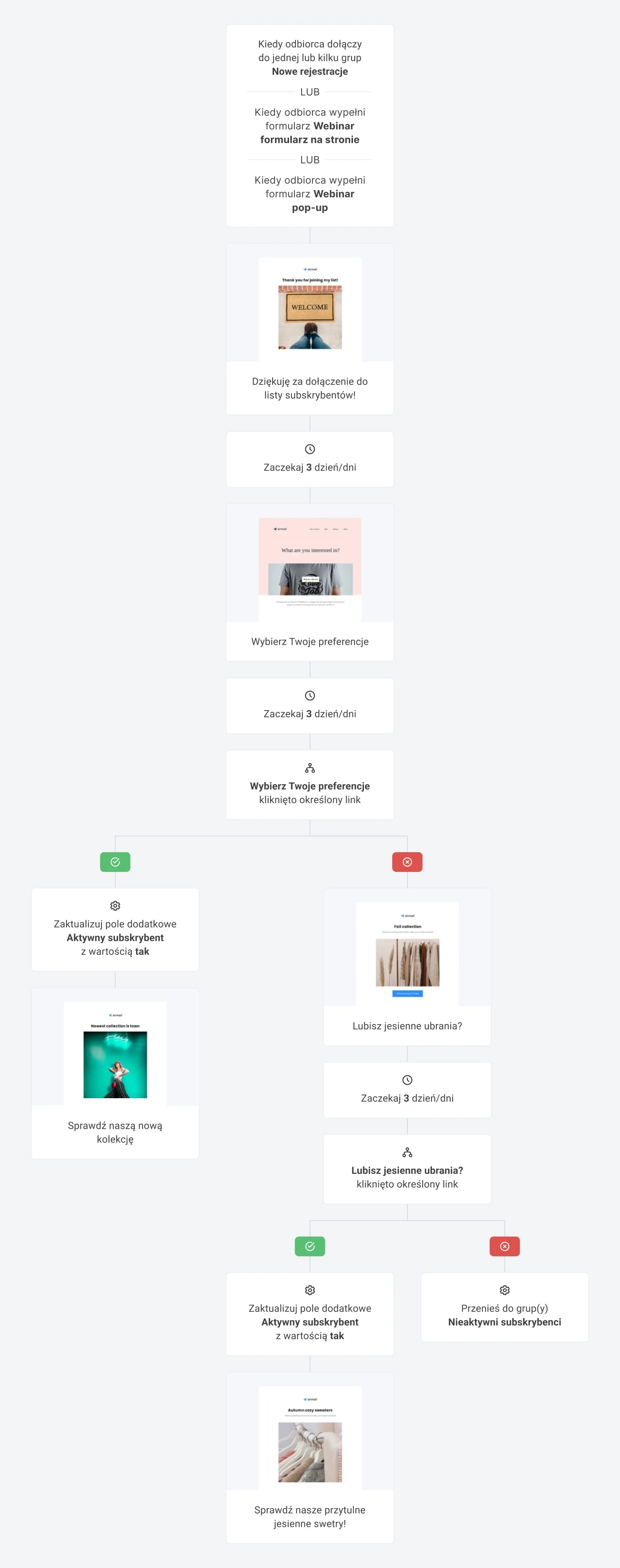 Jeśli masz wiele punktów wejścia do Twojej listy, takich jak darmowy materiał do pobrania i bezpłatna wersja próbna, warto utworzyć osobny powitalny e-mail dla każdego z nich. Możesz też skonfigurować automatyzację z wieloma wyzwalaczami, jeśli Twój ESP (dostawca usług do e-mail marketingu) na to pozwala.