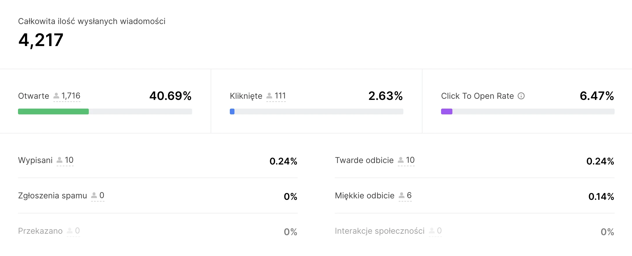 Większość narzędzi do e-mail marketingu śledzi otwarcia i kliknięcia. Dostarczają również danych na temat interakcji poszczególnych subskrybentów z wiadomościami.