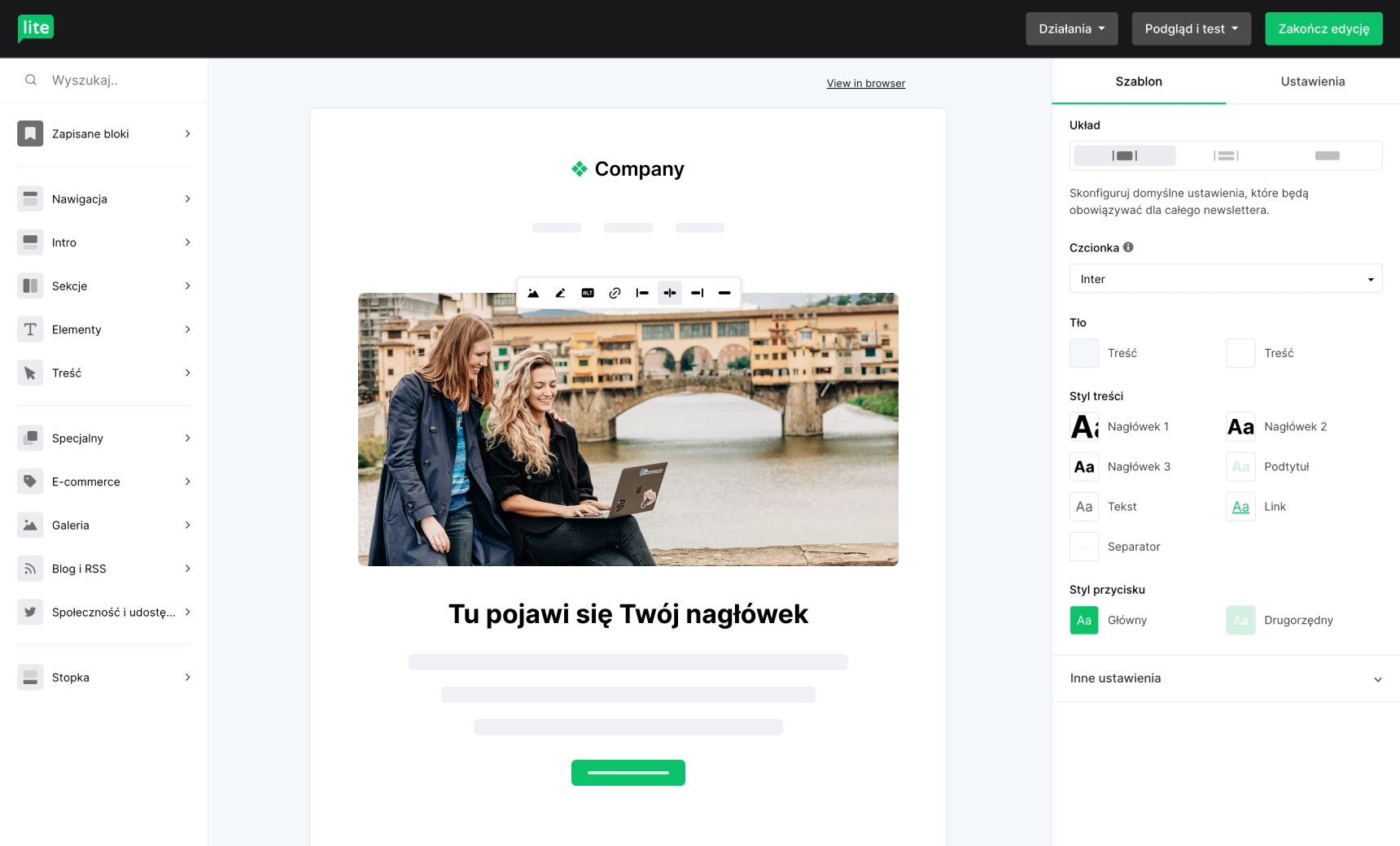 Wybieraj spośród ponad 70 bloków e-maili, które możesz dostosować do swoich potrzeb. Wśród nich znajdziesz między innymi: blok ankiety, galerie zdjęć, bloki artykułów, bloki mediów społecznościowych, bloki RSVP, bloki nawigacyjne i wiele innych.