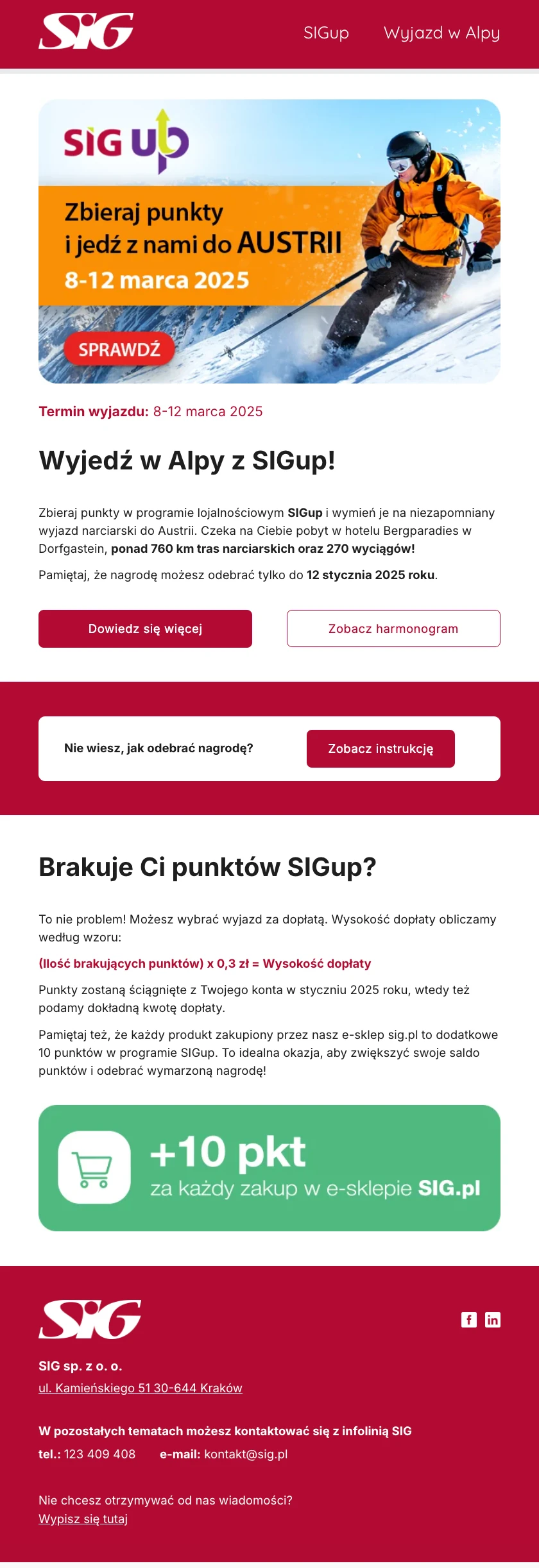Komunikacja z uczestnikami programu lojalnościowego SIGup: E-mail jest podstawowym kanałem komunikacji z uczestnikami programu, dostarczając im informacji o zebranych punktach, nowościach, oraz ofertach specjalnych.