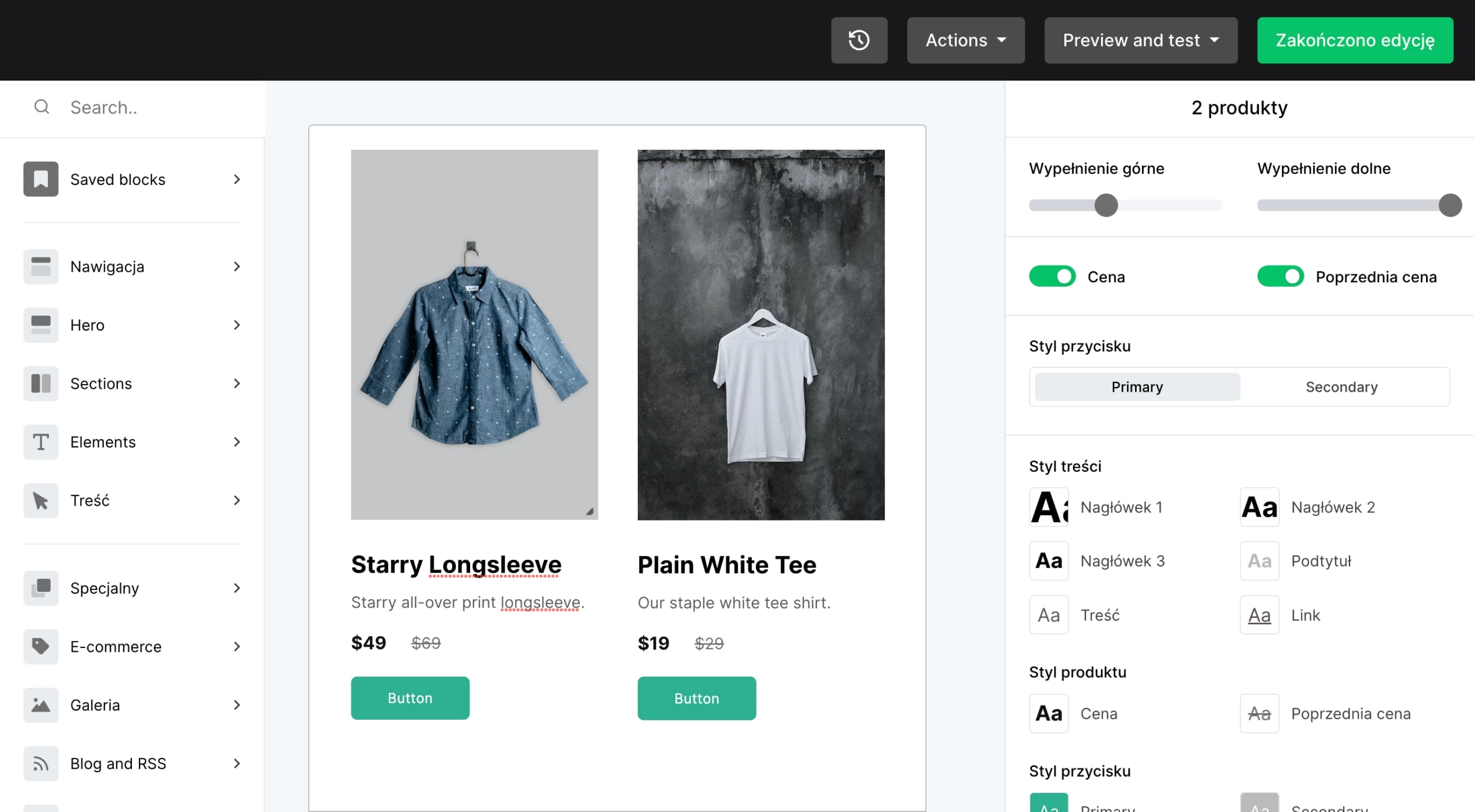 Zaciągnij produkty z Twojej platformy e-commerce do poszczególnych bloków newslettera dotyczących produktów. Zaoszczędź mnóstwo czasu dzięki automatycznemu importowi zdjęć, opisów i cen produktów wprost do newslettera.