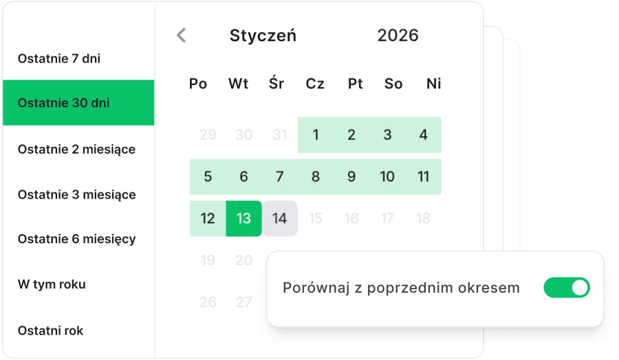 Zobacz realny wpływ swojej strategii dzięki raportom porównawczym. Wybierz dowolny zakres dat i bez trudu porównaj go z poprzednim okresem.