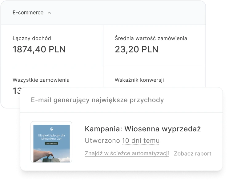 Śledź otwarcia, kliknięcia, zamówienia i wiele więcej w raportach z kampanii i automatyzacji. Zobacz, co działa na odbiorców i wykorzystuj to w dalszej strategii.
