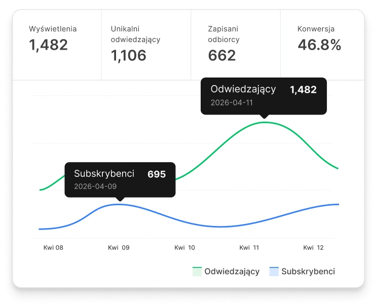 Śledź codzienne konwersje, wyświetlenia i zapisy nowych subskrybentów dla każdego osadzonego formularza, pop-upu i promocji. Wykryj swoje najlepsze elementy i wykorzystaj ich potencjał.