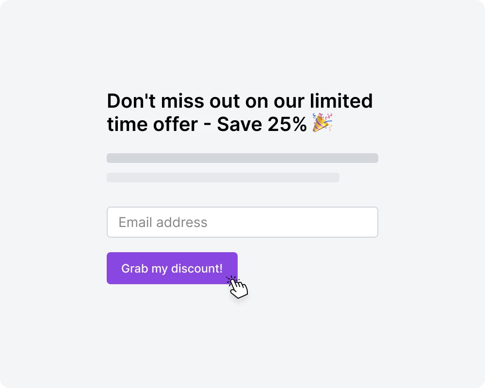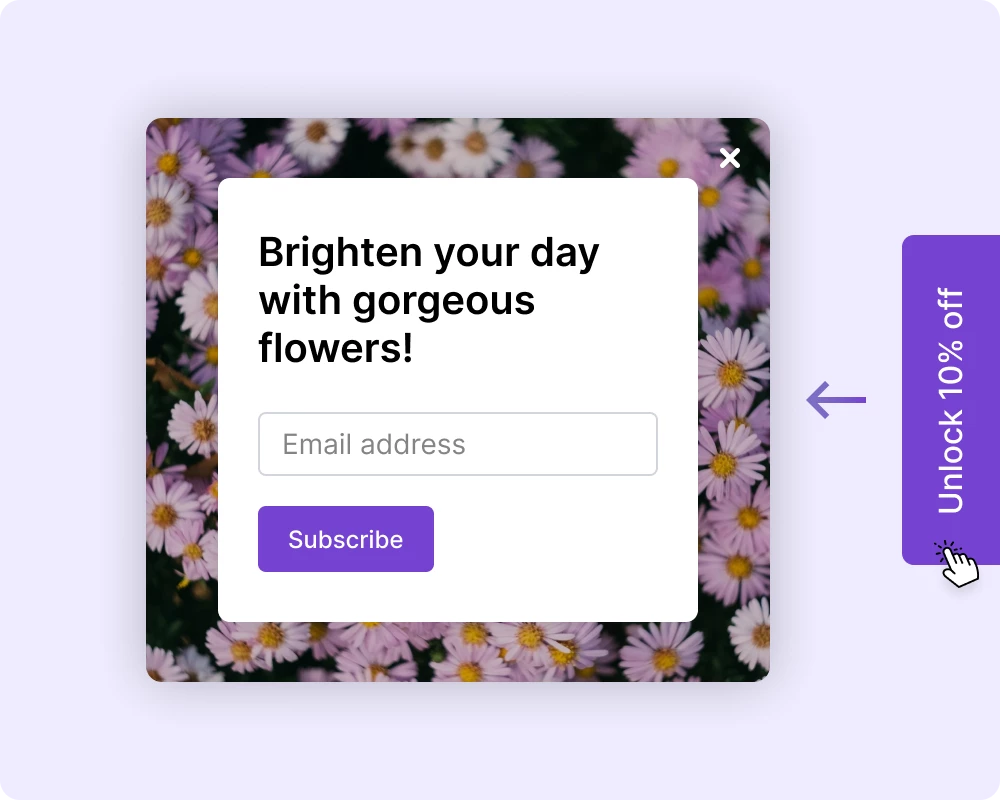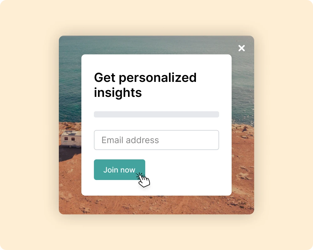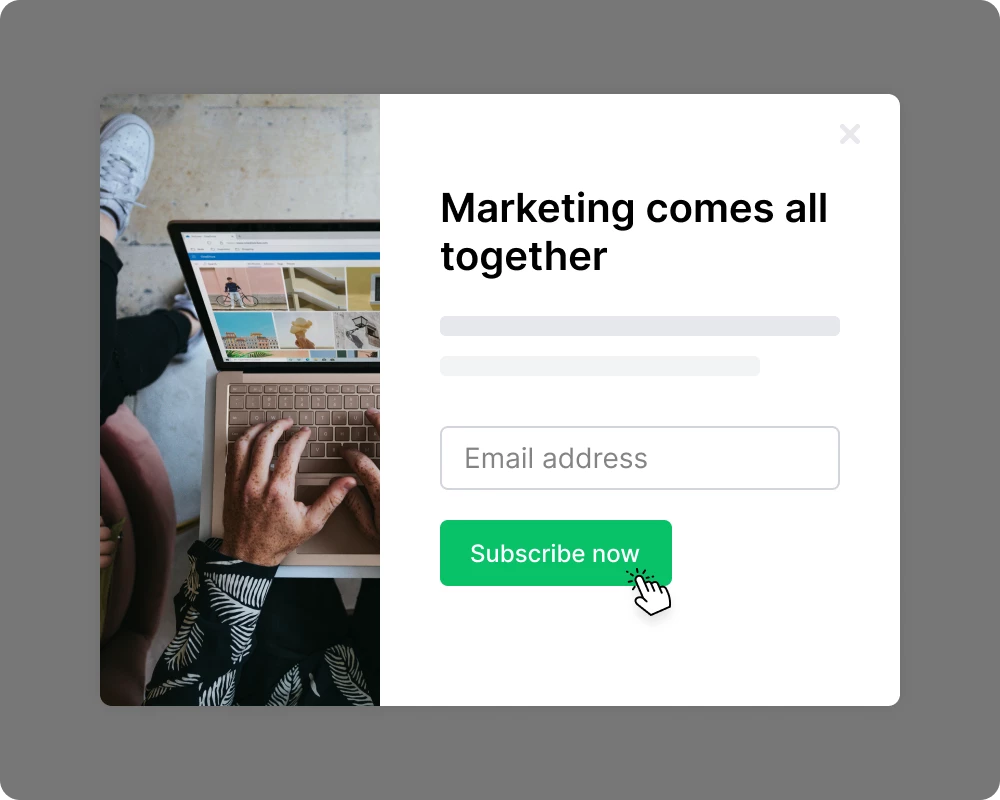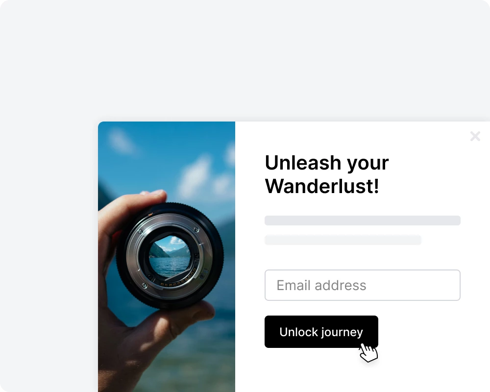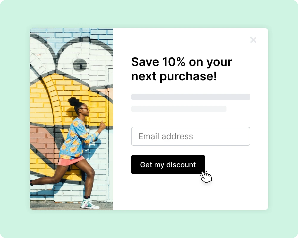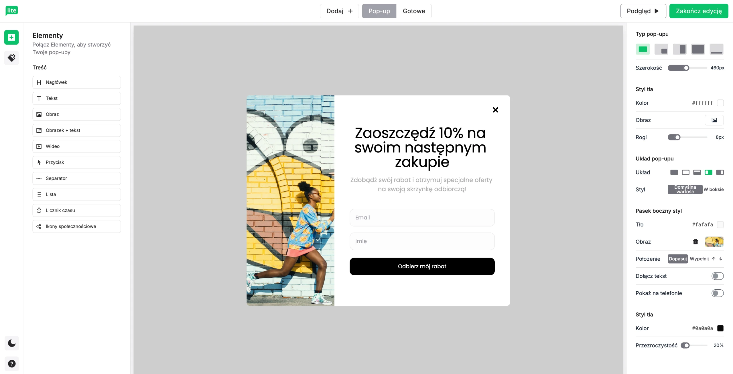 Promuj Twój newsletter, informuj odwiedzających o konsultacjach lub ogłaszaj wyprzedaż. Pop-upy mogą mieć pole rejestracji e-mail, przycisk z CTA lub udostępniać kod rabatowy.
