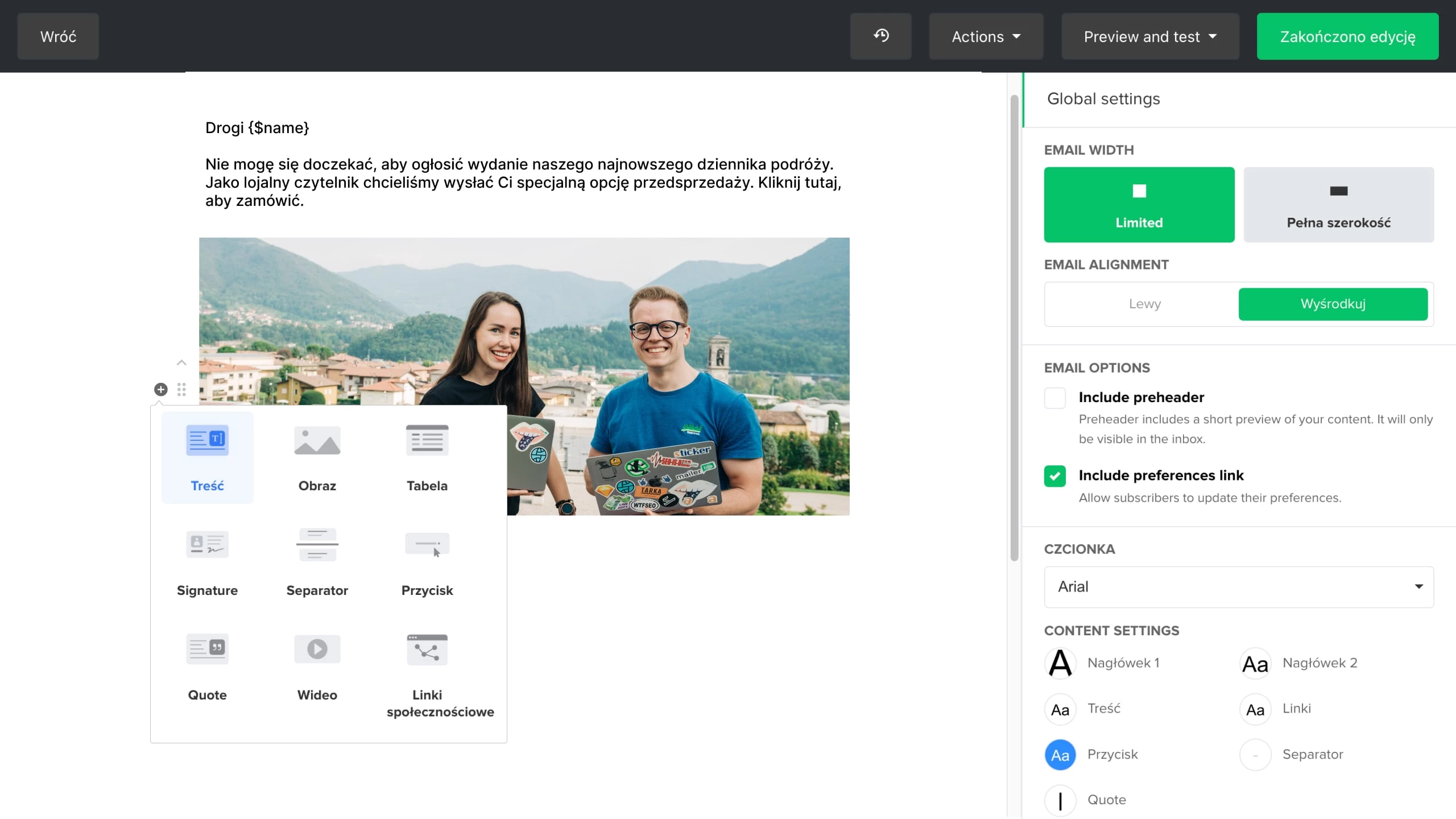 Projektuj e-maile tekstowe z osobistym akcentem. Możesz dodawać obrazy, przyciski CTA, filmy i dołączać podpis oraz zdjęcie profilowe!