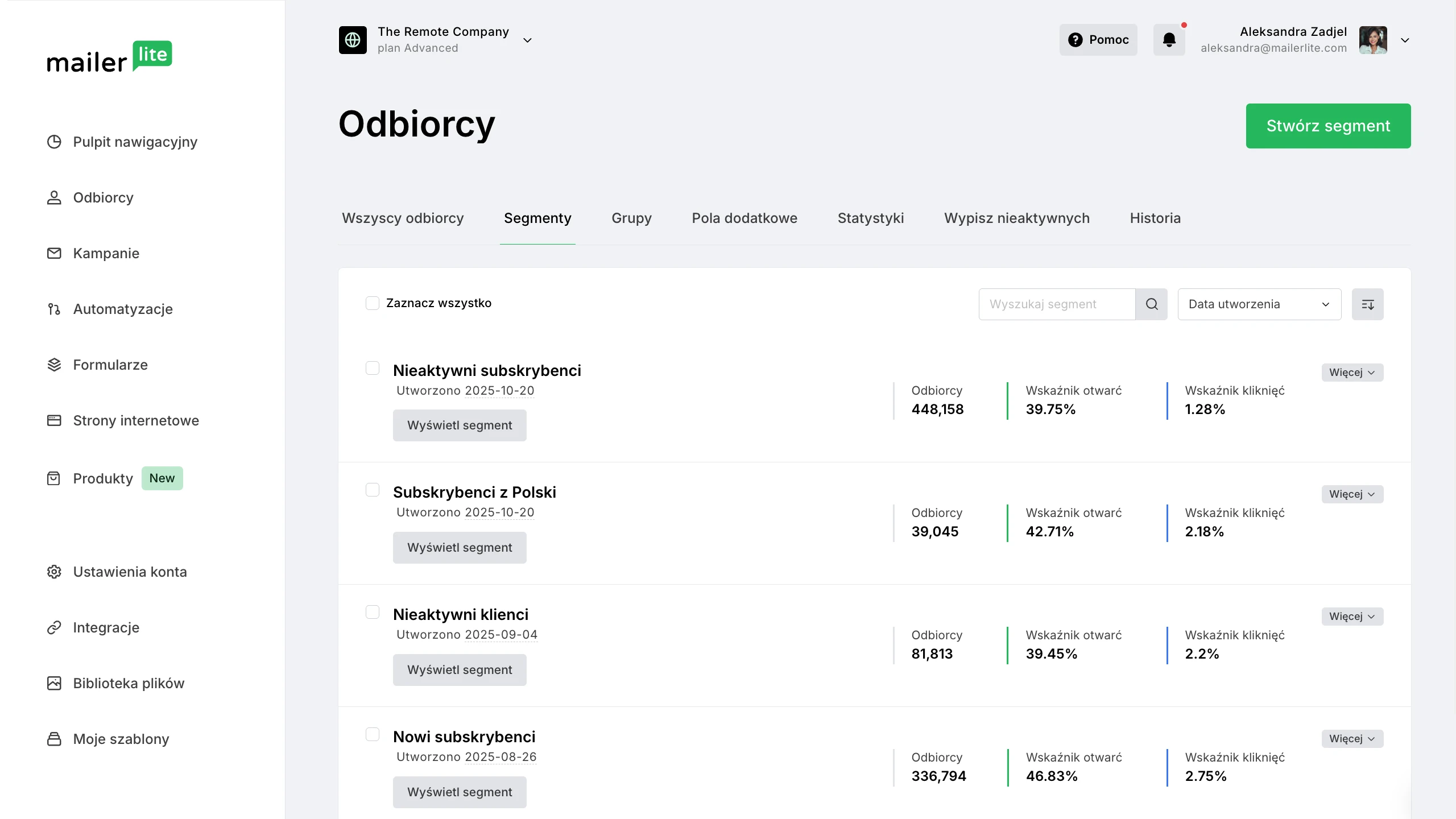Stwórz dowolny typ odbiorców i odbiorczyń, który pomoże Ci wysyłać bardziej ukierunkowane e-maile i osiągać cele marketingowe. MailerLite automatycznie aktualizuje każdy segment w miarę powiększania listy. Możesz segmentować odbiorców i odbiorczynie na wiele sposobów.