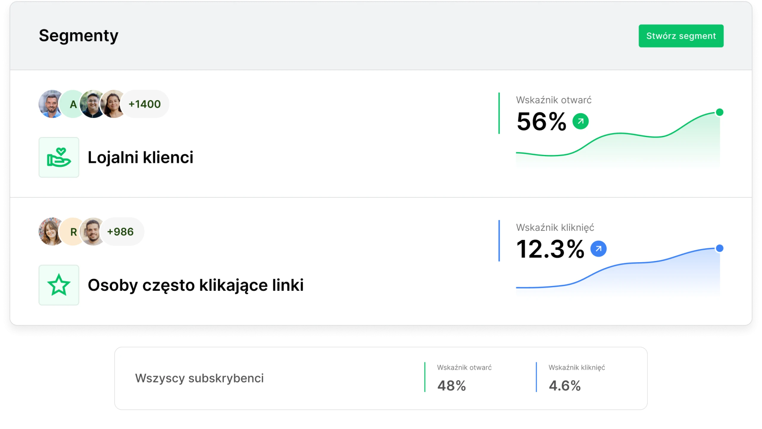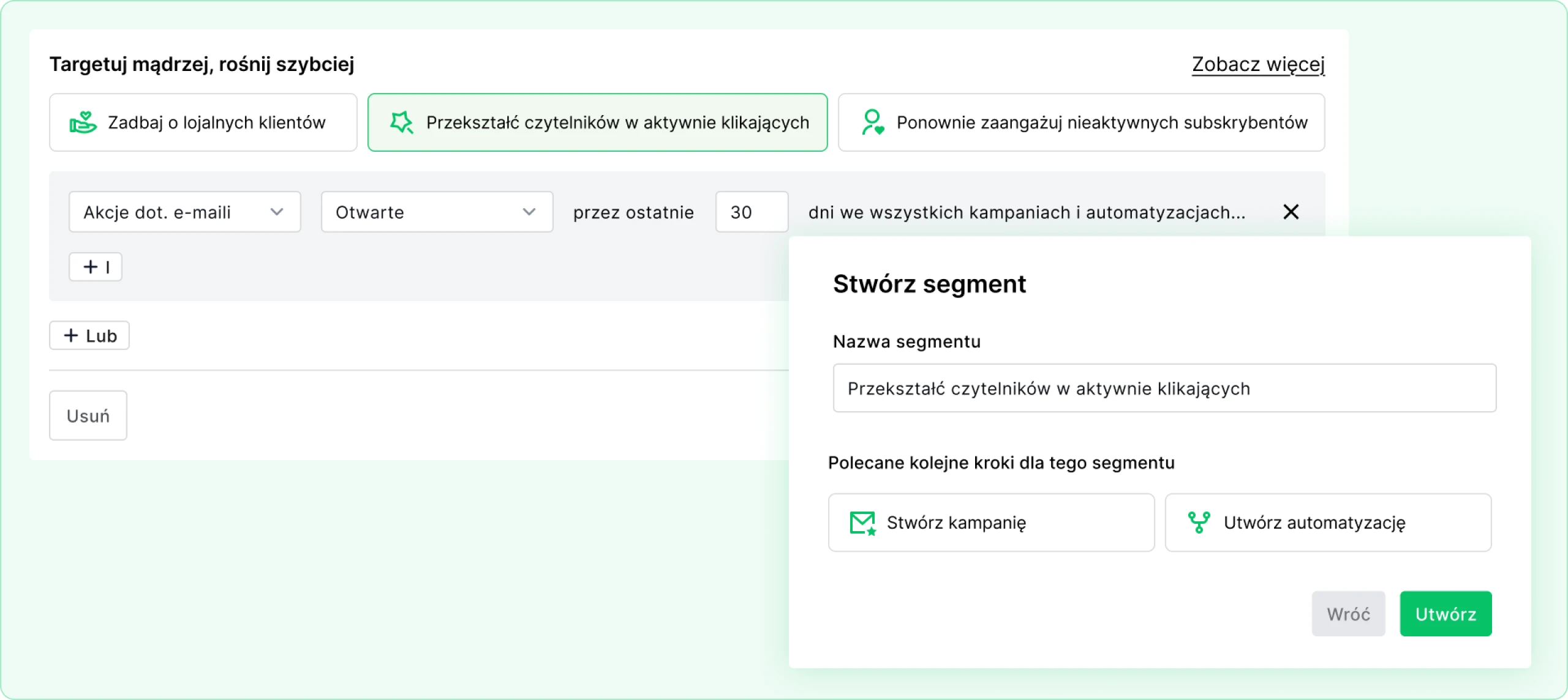 Filtruj subskrybentów na podstawie ich aktywności. Wysyłaj ekskluzywne oferty do lojalnych czytelników i kampanie aktywizujące do tych niezaangażowanych.