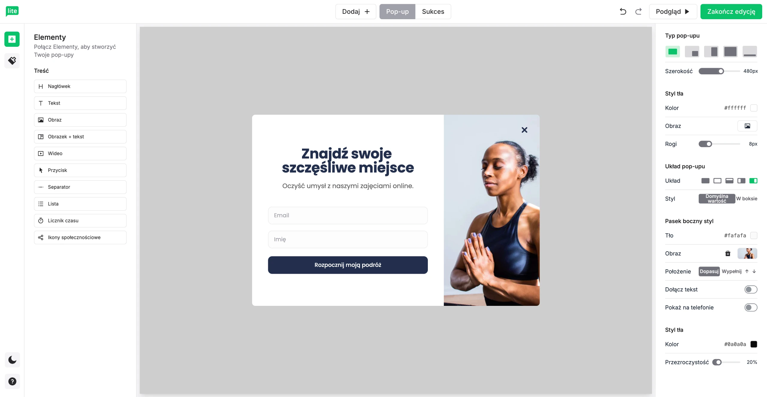 Zachęć do rejestracji za pomocą pop-upów promocyjnych, które przyciągną uwagę użytkowników i poprowadzą ich do konwersji. Dodaj do pop-upów promocyjnych liczniki, linki do sklepu z aplikacjami lub prośby o potwierdzenie wzięcia udziału w wydarzeniach i webinarach.