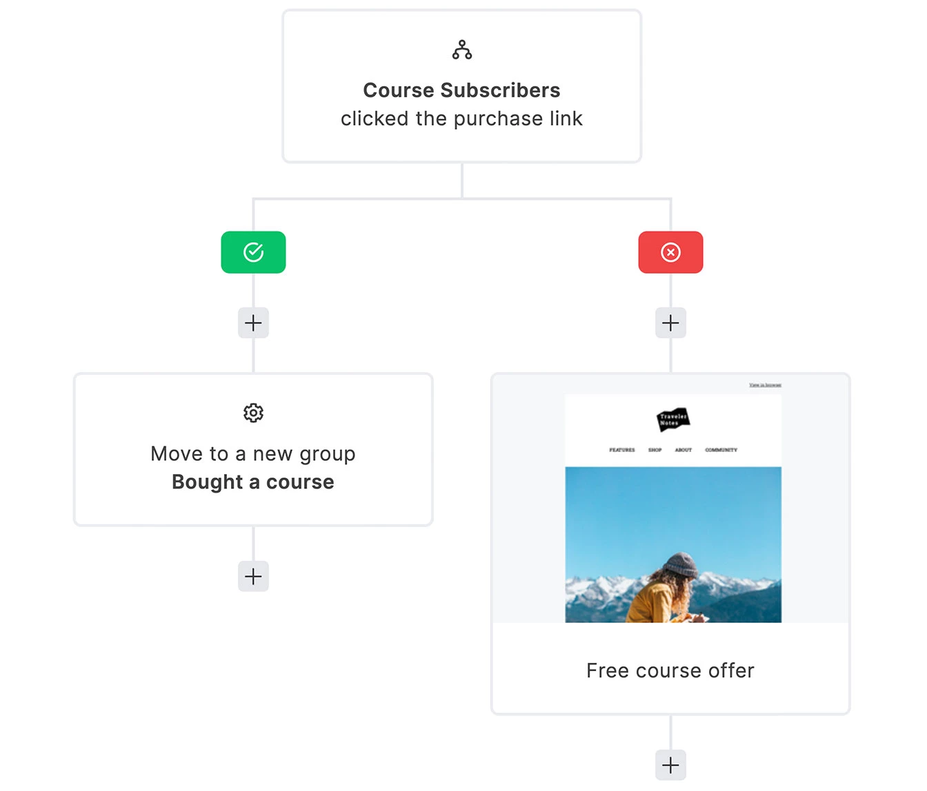Oszczędzaj czas, jednocześnie wspierając drogę od subskrybenta i subskrybentki do klienta i klientki. Użyj darmowego edytora scenariuszy automatyzacji MailerLite. Twórz niestandardowe ścieżki, które pozwalają subskrybentom i subskrybentkom samodzielnie dzielić się na poszczególne segmenty.