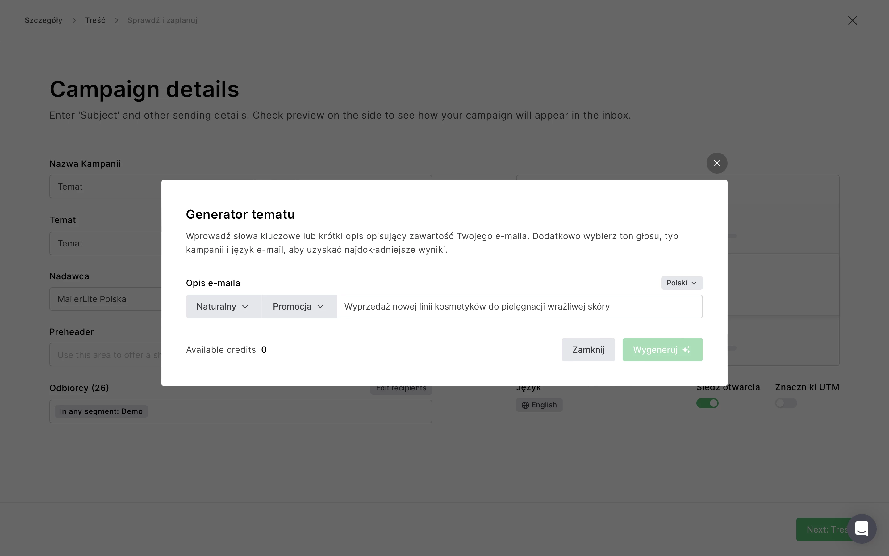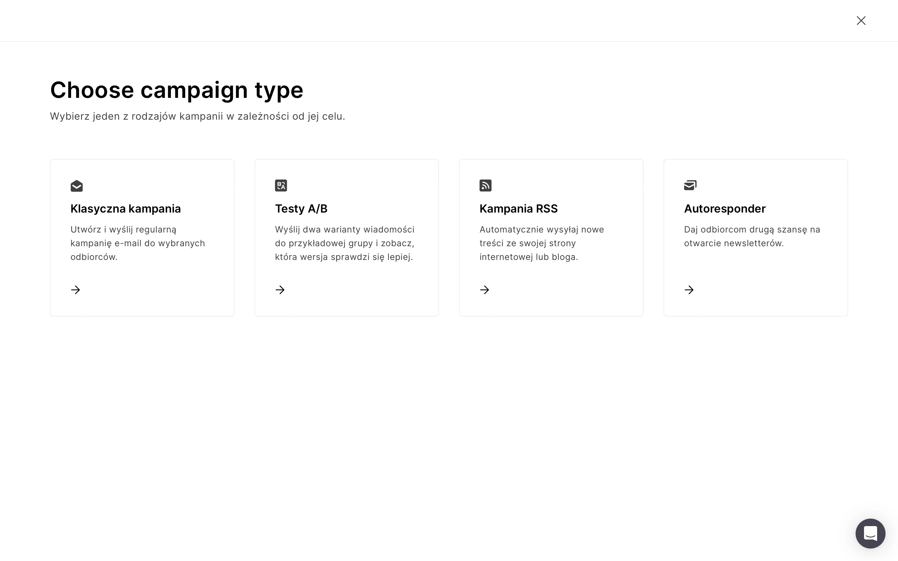 Wybierz rodzaj kampanii. Generator tematów AI jest dostępny dla wszystkich typów kampanii.