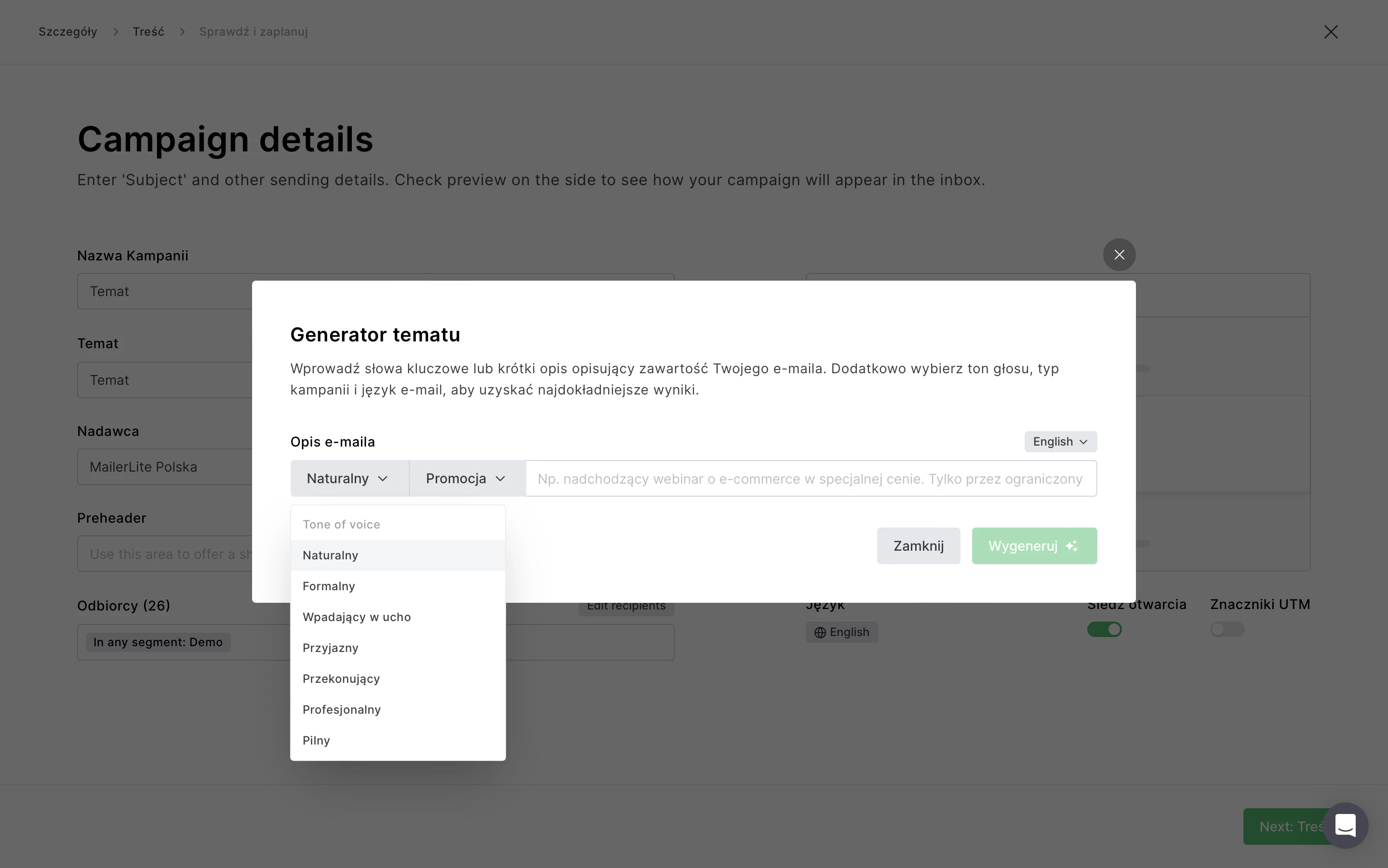 Wybór odpowiedniego tonu głosu oraz rodzaju kampanii pomoże naszemu generatorowi zrozumieć lepiej cel Twojego e-maila. Na przykład, jeśli został wybrany ton formalny, sztuczna inteligencja wybiera słownictwo, które jest często używane w oficjalnych i profesjonalnych wiadomościach. Może unikać slangu, skrótów i wyrażeń potocznych.