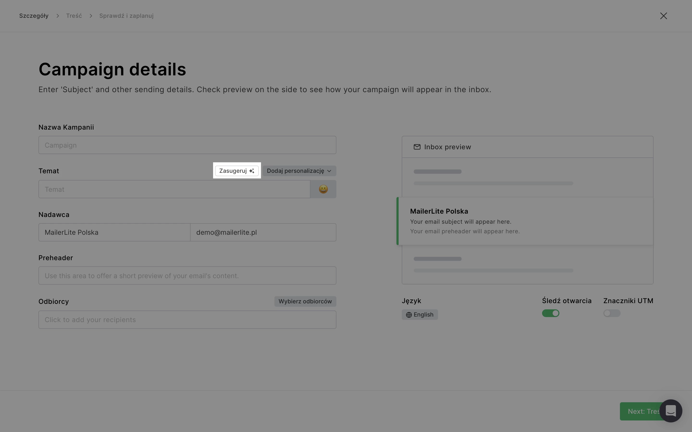 5. Nad polem Temat kliknij przycisk Zasugeruj.